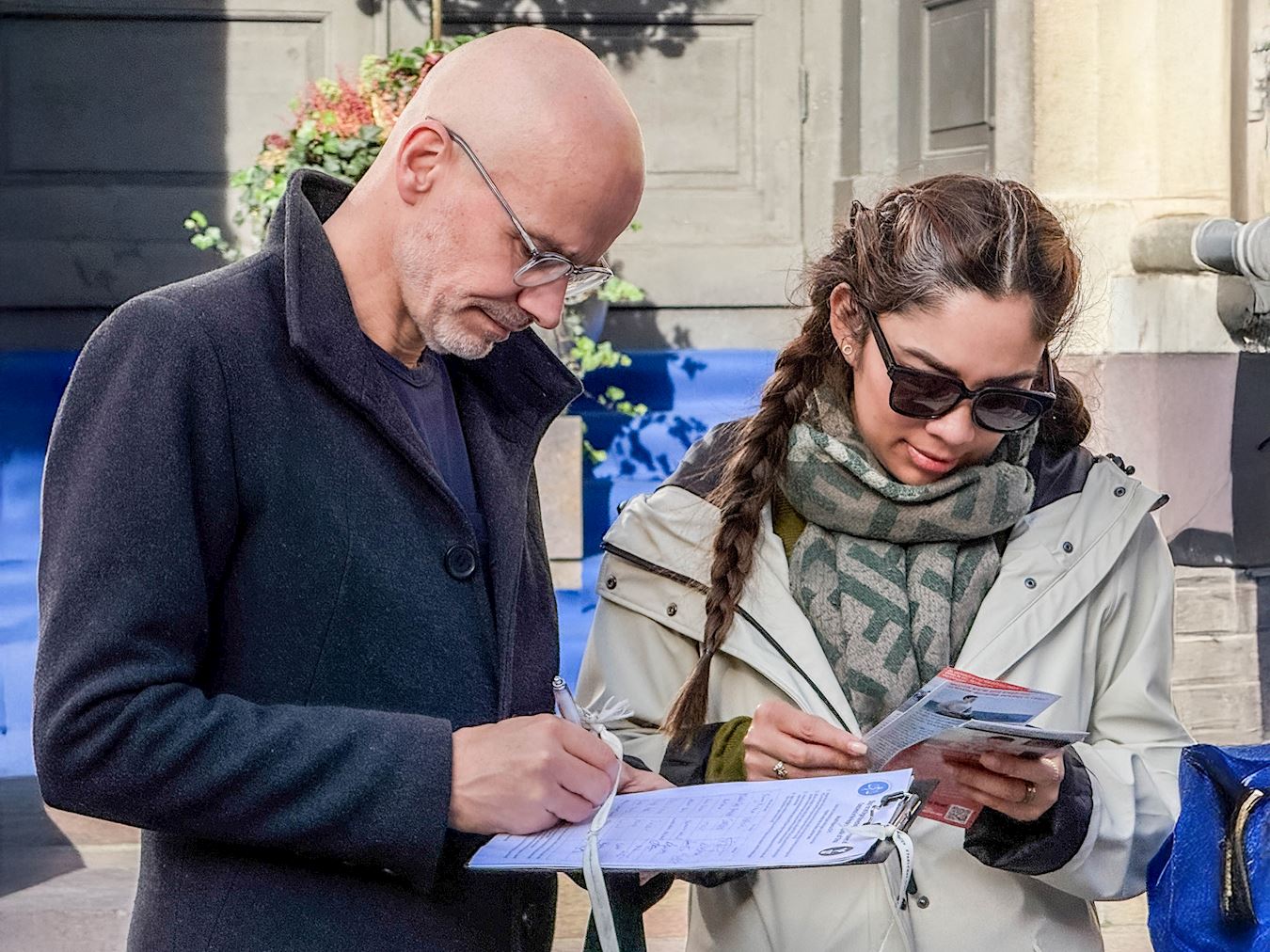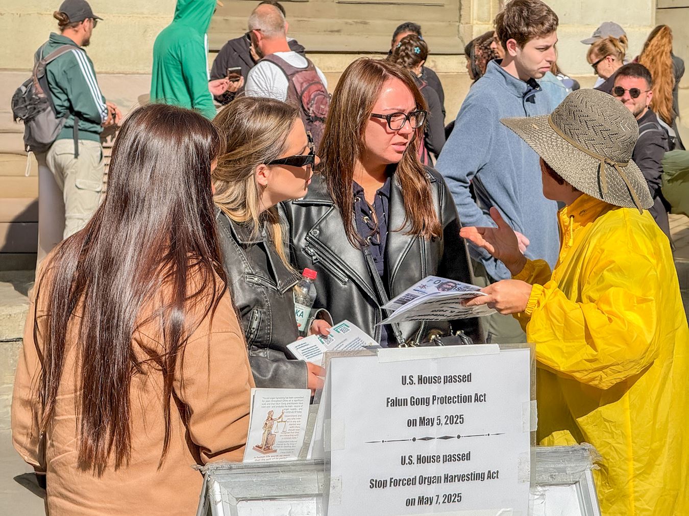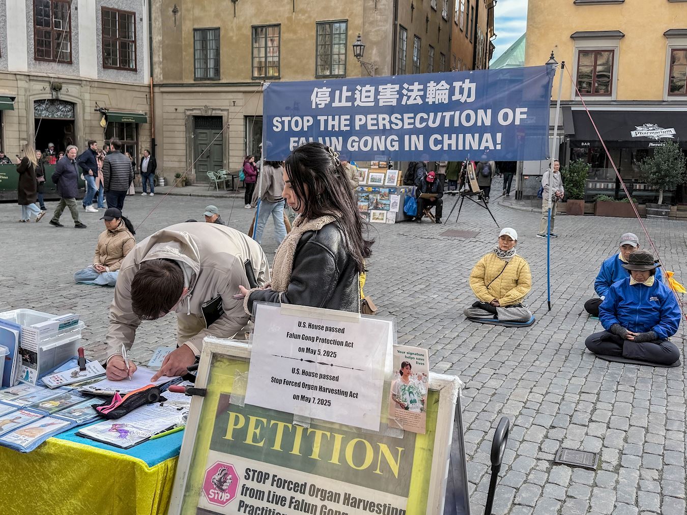 | 【明慧网二零二五年十月十五日】(明慧瑞典记者站斯德哥尔摩报道)自进入二零二五年十月以来,每个周五至周日连续三天的下午,法轮功学员都在诺贝尔博物馆前举办讲真相反迫害征签活动。揭露中共对大陆法轮功学员长达二十六年的迫害和活摘法轮功学员器官的暴行,以及中共在美国发动法律战、舆论战、在世界各地散布虚假信息等跨国镇压恶行。活动得到了各界民众的关注和支持。 秋意渐浓的十月,时值一年一度的诺贝尔奖“开奖周”。瑞典首都斯德哥尔摩是诺贝尔的故乡,本年度诺贝尔奖于十月六日至十三日陆续揭晓,每年的此时这里都吸引着当地民众及来自世界各地的观光客纷至沓来。  图1~2:二零二五年十月以来,每个周五至周日的下午,法轮功学员在诺贝尔博物馆前举办讲真相征签活动。 |