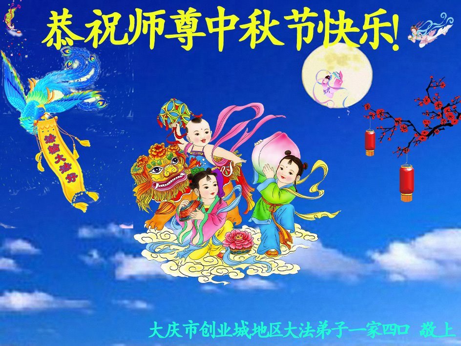 黑龙江省大庆市创业城地区大法弟子一家四口恭祝师尊中秋节快乐!
