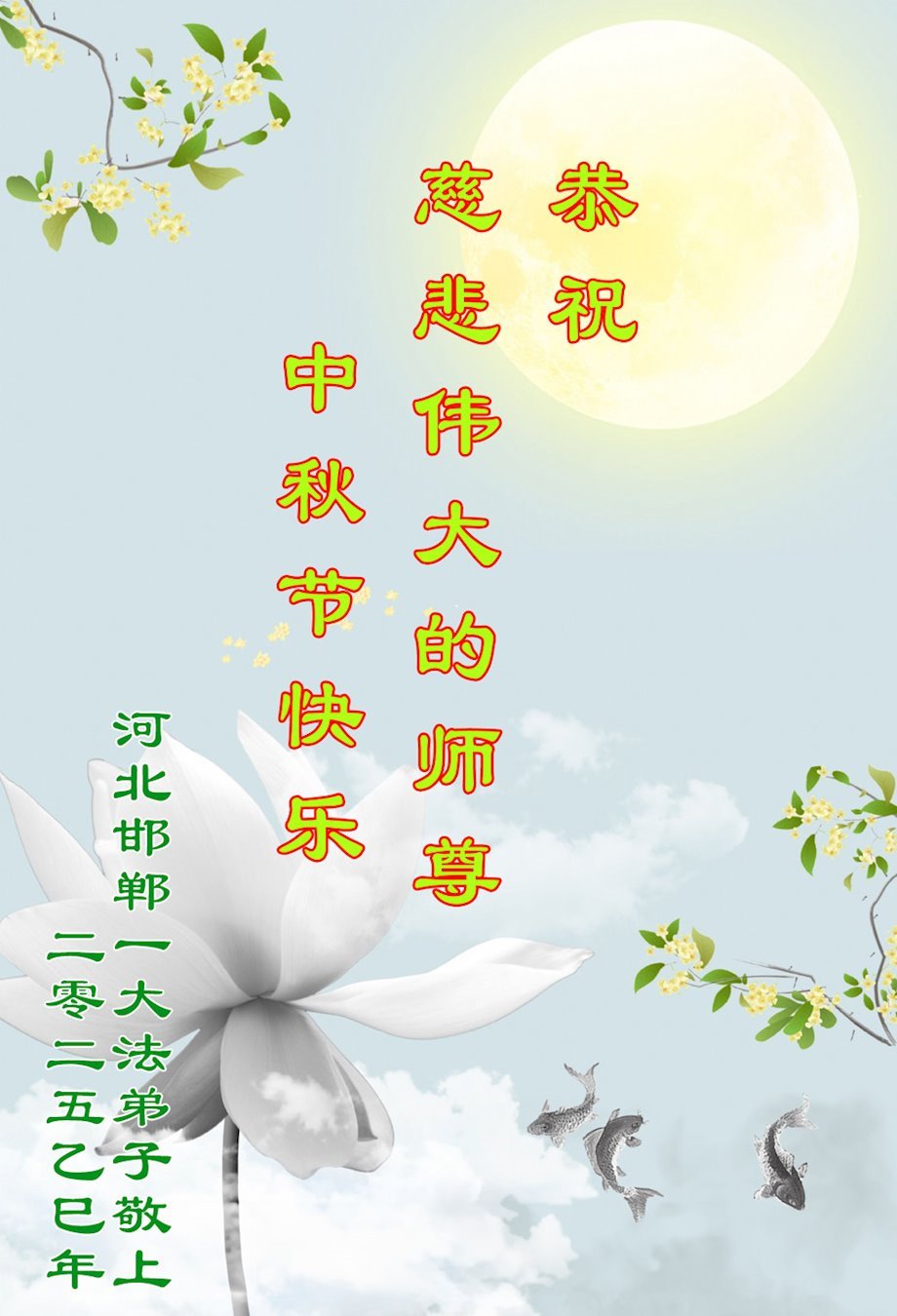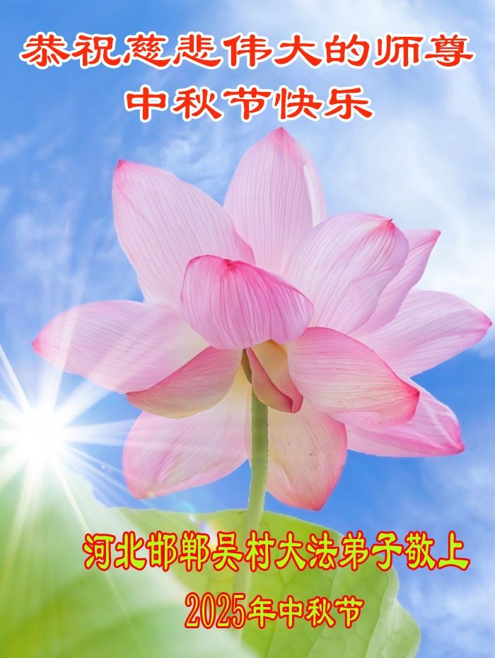 恭祝师尊中秋快乐!感恩师尊慈悲苦度! 弟子们正念正行,助师正法,以报师恩。谢谢师尊!弟子们想您! 衡水市深州市深南一学法小组大法弟子携全家敬上 二零二五年九月二十六日 河北省邯郸一大法弟子恭祝慈悲伟大的师尊中秋节快乐!