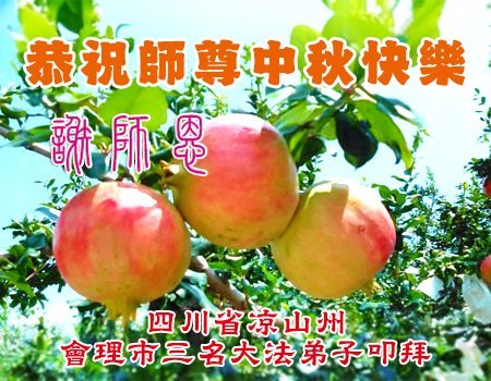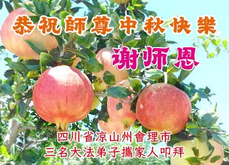 恭祝师尊中秋快乐! 四川省凉山州会理市三个大法弟子敬上 四川省凉山州会理市三个大法弟子携家人恭祝师父中秋快乐!