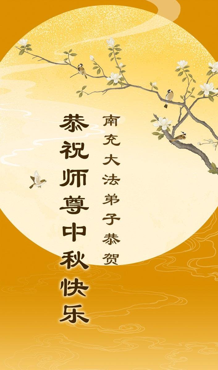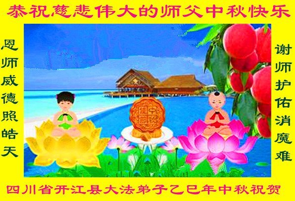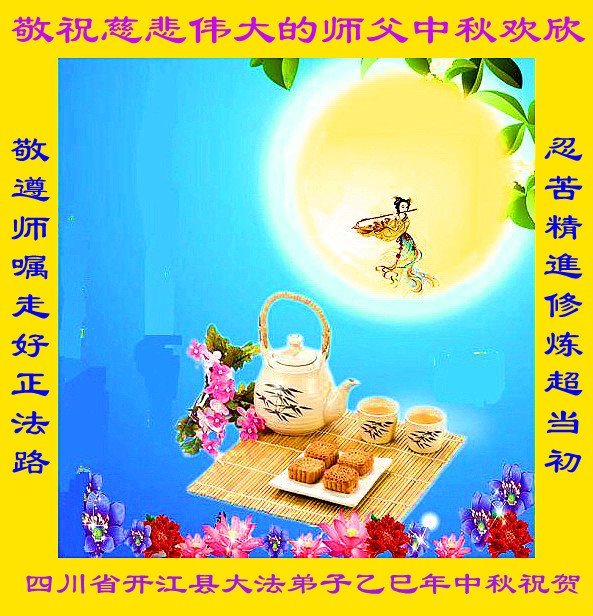 尊敬的师父您好!您辛苦了!中秋佳节即将来临,恭祝师父中秋节快乐!谢谢师父对弟子的救度之恩!您为弟子承受了那么多的业力。弟子唯有做好三件事,配合好整体多救人。弟子叩拜师父!感恩师父! 四川省南充顺庆一大法弟子敬上 四川省达州市开江县大法弟子敬祝慈悲伟大的师父中秋节快乐!