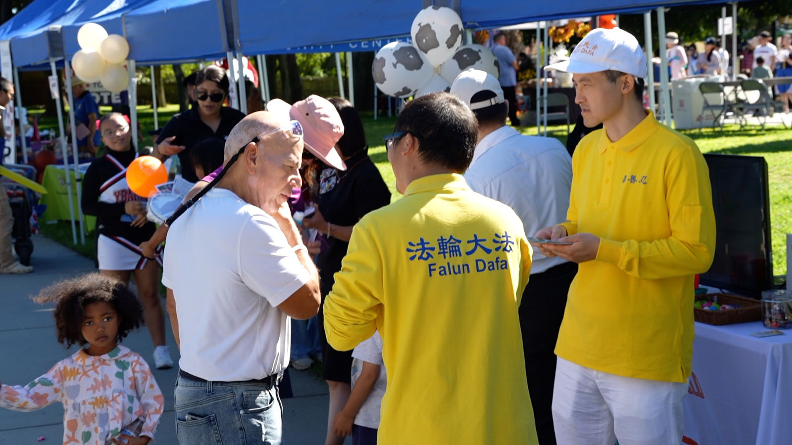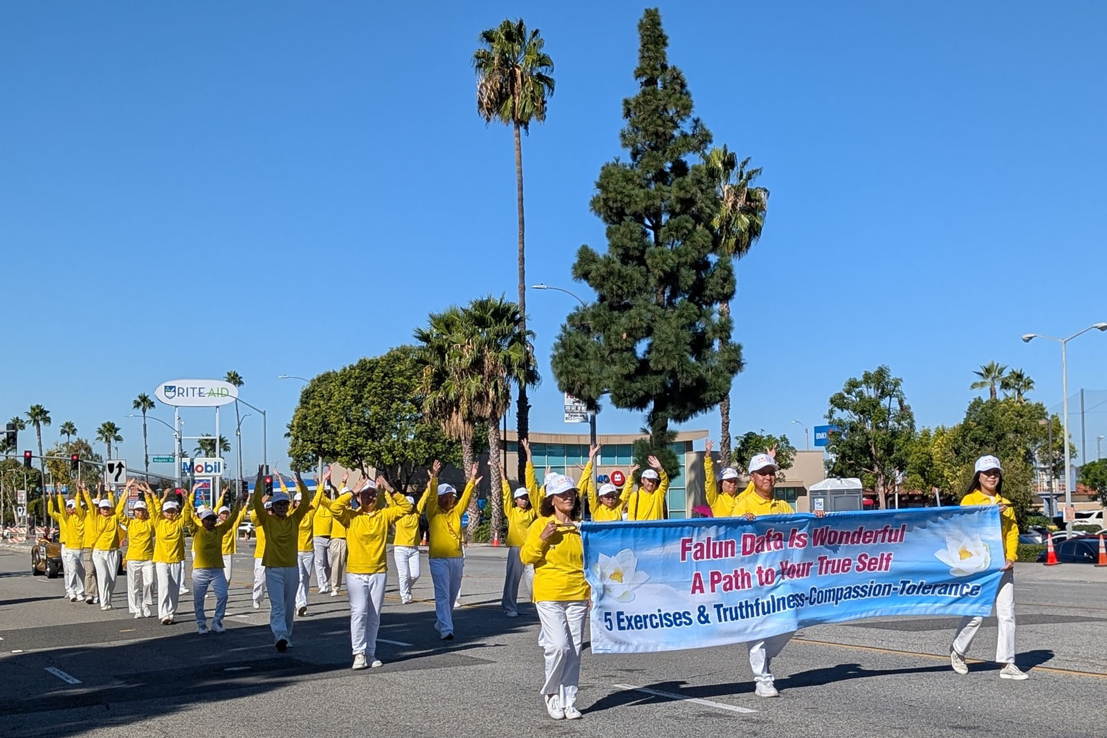 游行于上午九点从诺加莱斯街(Nogales Street)出发,沿着科利马路(Colima Road)前进,直达罗兰岗公园(Rowland Heights Park)。法轮大法队伍的出现,为充满拓荒者历史与西部牛仔元素的社区“马车节”增添了丰富的中华文化色彩与精神内涵。 法轮大法游行队伍的第一个阵列,由二十余位身着鲜黄色服饰的腰鼓队成员组成,他们以整齐的队形与节奏鲜明的鼓声,展现法轮大法“真、善、忍”的核心精神。队员们步伐有力,鼓声洪亮,不仅洋溢着活力与喜悦,也传递出中国传统文化的优美与身心调谐的理念。 紧接着,第二个阵列的三十余位成员现场演示了法轮功五套功法中的“贯通两极法”。队伍前方举着写有英文“Falun Dafa Is Wonderful - A Path to Your True Self”(法轮大法好——通向真我之路)的横幅,吸引了许多驻足观看的民众。学员们祥和而自信的笑容,以及他们所展现出的修炼者的正面精神面貌,获得了观众的热烈欢迎。 许多民众在队伍前拍照留念,并送上掌声与鼓励。游行主持人也在广播中特别介绍,法轮大法是一种以“真、善、忍”为根本的身心修炼法,强调其促进健康与提升生活品质的理念,让社区民众有机会深入了解这个信仰团体。 游行结束后,法轮大法学员在罗兰岗公园集体炼功,吸引更多民众驻足观赏与交流,旁边的展位则透过发放资料和小莲花,向民众传递修炼的美好与法轮功学员在中国仍遭中共严重迫害的真相。 法轮大法团体的参与,不仅为马车节活动增添了一道亮丽的风景线,更展现了社区对健康、和平与多元精神文化的支持与包容。