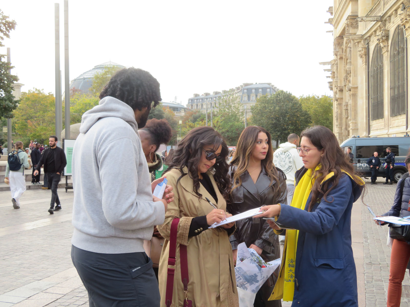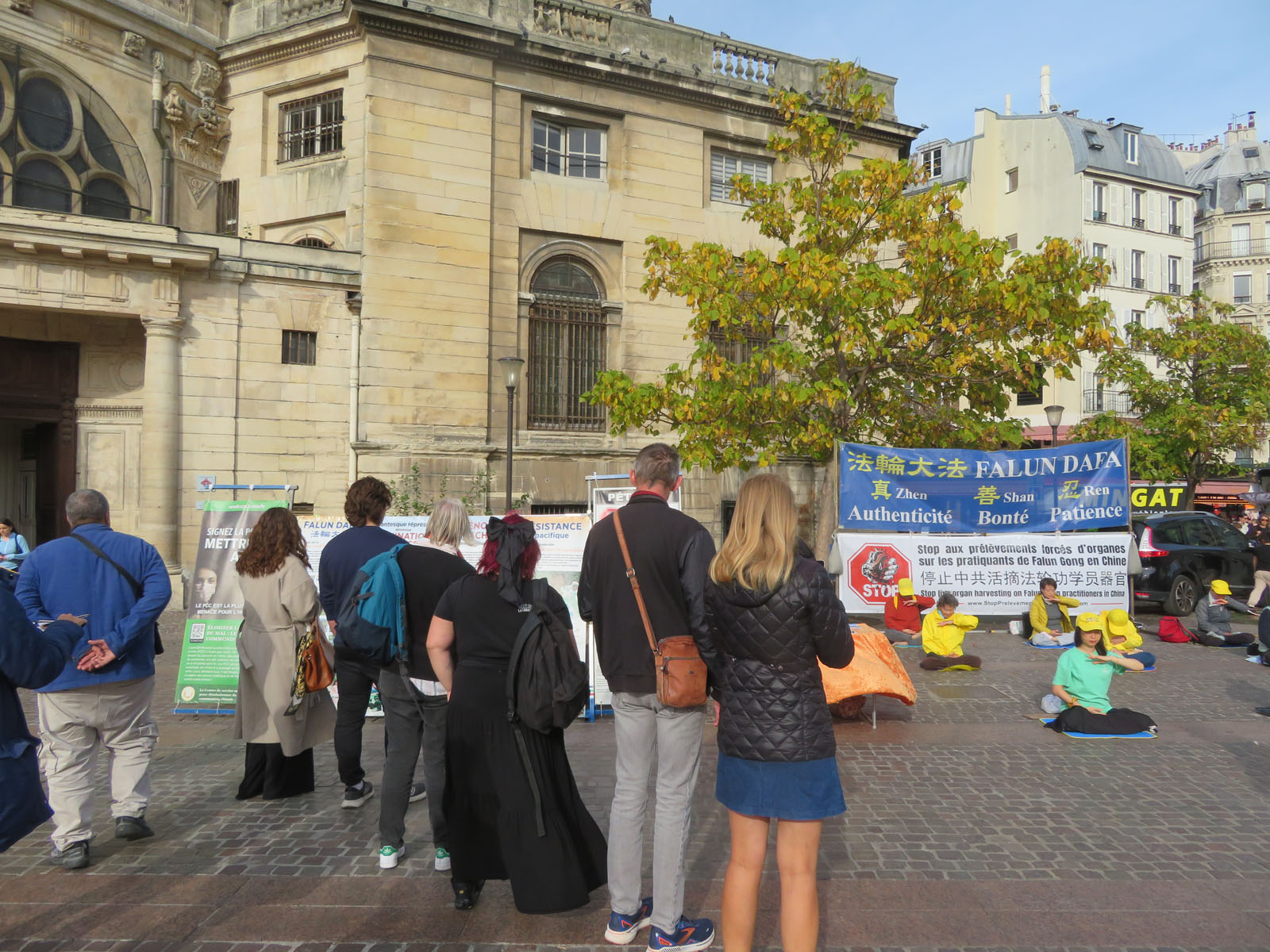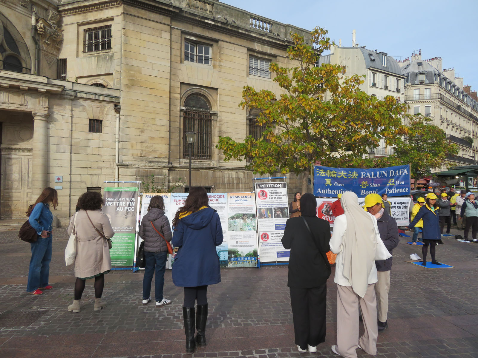 | 【明慧网二零二五年十月二十一日】二零二五年十月十八日星期六下午,法轮功学员再次来到巴黎中心的夏特莱街区,向人们介绍法轮功及中共对法轮功学员长达二十六年的迫害。当天天气晴朗,人流不断。很多人得知法轮功被迫害真相后,在反迫害征签表上签名,都想要为停止迫害出一把力。 上一个周末即十月十日至十二日,法轮功学员参加了法国西部南特市举办的健康与有机食品沙龙,他们向来宾介绍法轮功并教功,受到群众的欢迎。  图1~4:二零二五年十月十八日星期六下午,法轮功学员再次来到巴黎中心的夏特莱街区弘法。 |