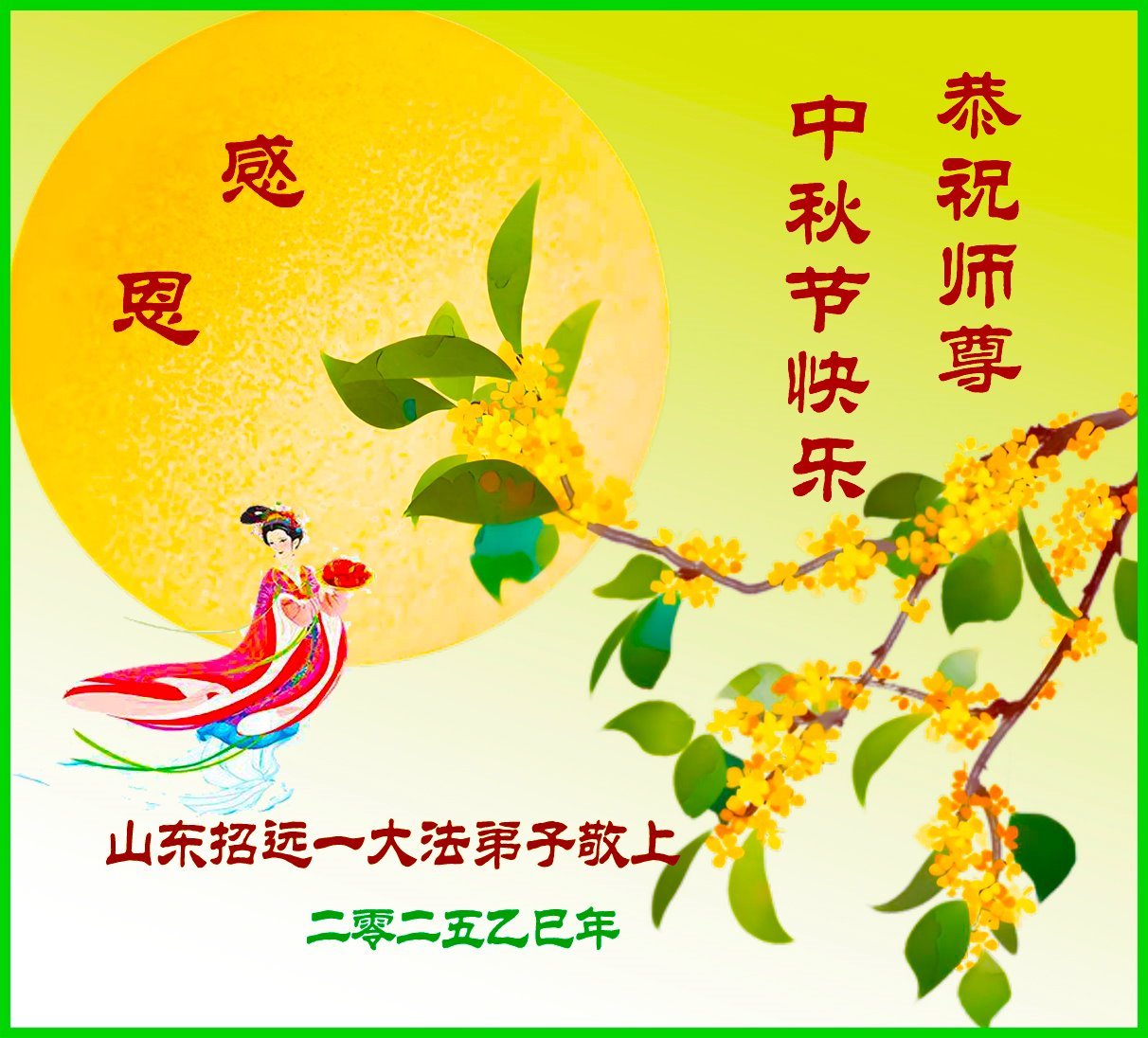 恭祝师父中秋节快乐! 师父您好!师父您辛苦了!您为救众生付出了一切。弟子一定好好修,精進证实大法,跟您回家。 山东省招远一大法弟子敬上 山东省烟台市招远市玲珑镇一学法小组大法弟子恭祝师尊中秋节快乐!