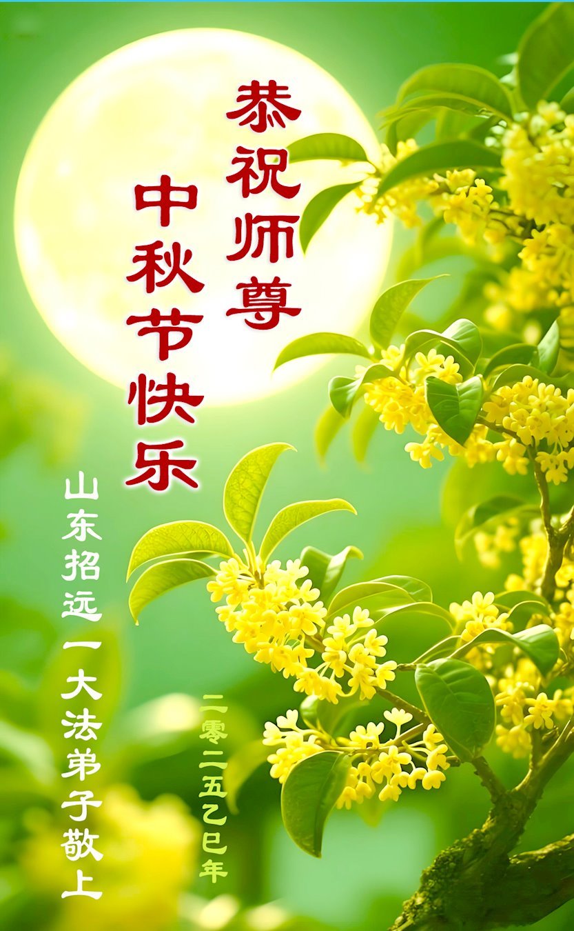 恭祝慈悲伟大的师父中秋节快乐! 感恩师父的慈悲救度!感恩修炼路上师父的一路保护。谢谢师父!师父您辛苦了!弟子今后要更加精進,修好自己,做好三件事,跟师父回家! 山东省烟台市芝罘区—大法弟子敬上 二零二五年九月十七日 山东省威海市荣成市一学法小组大法弟子恭祝师尊中秋节快乐!