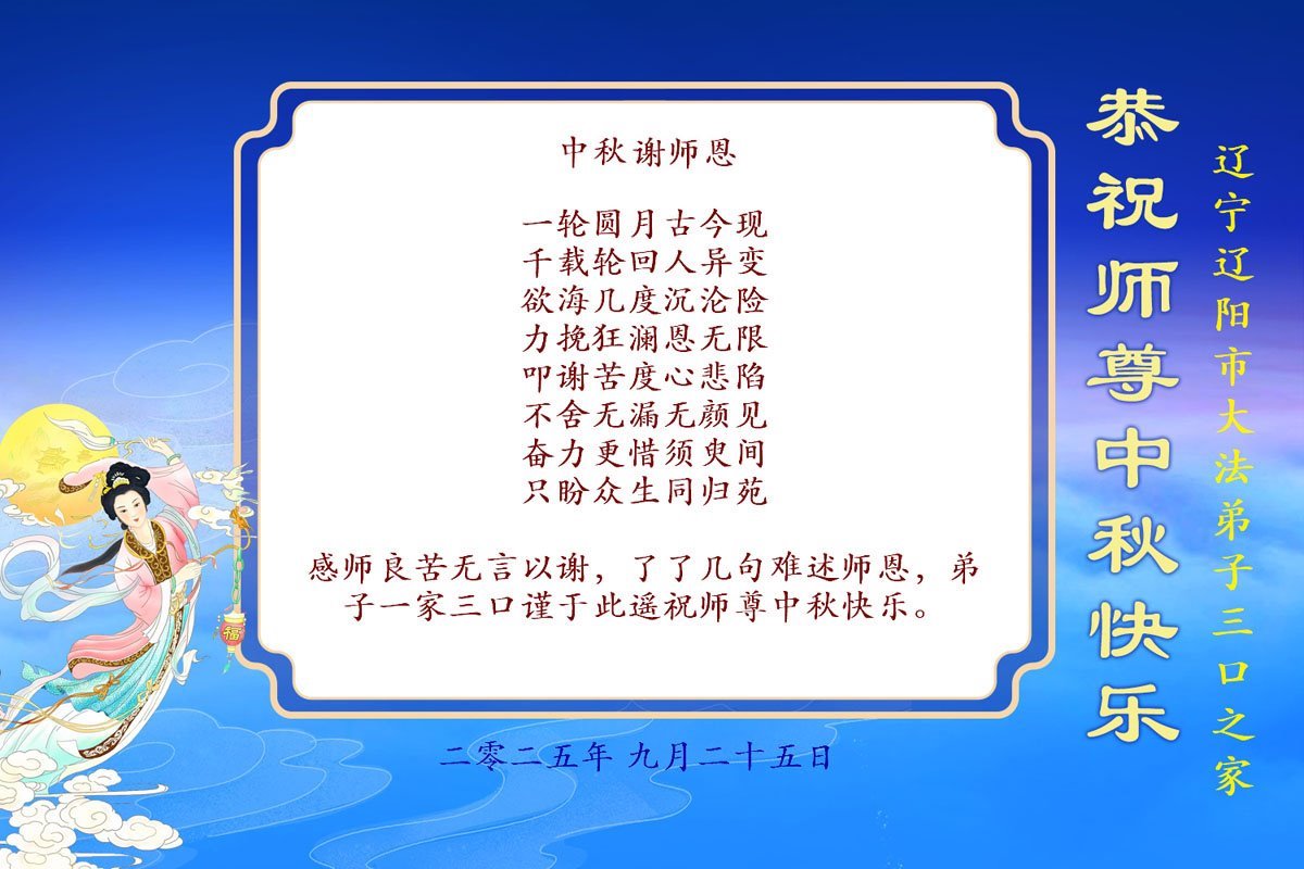 辽宁辽阳市一家三口大法弟子恭祝师父中秋快乐!