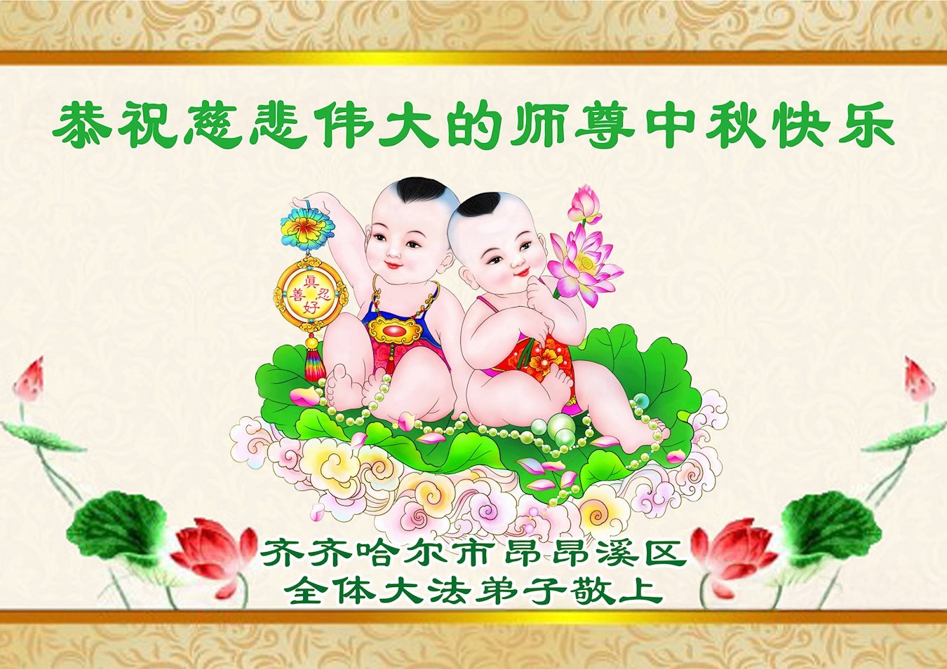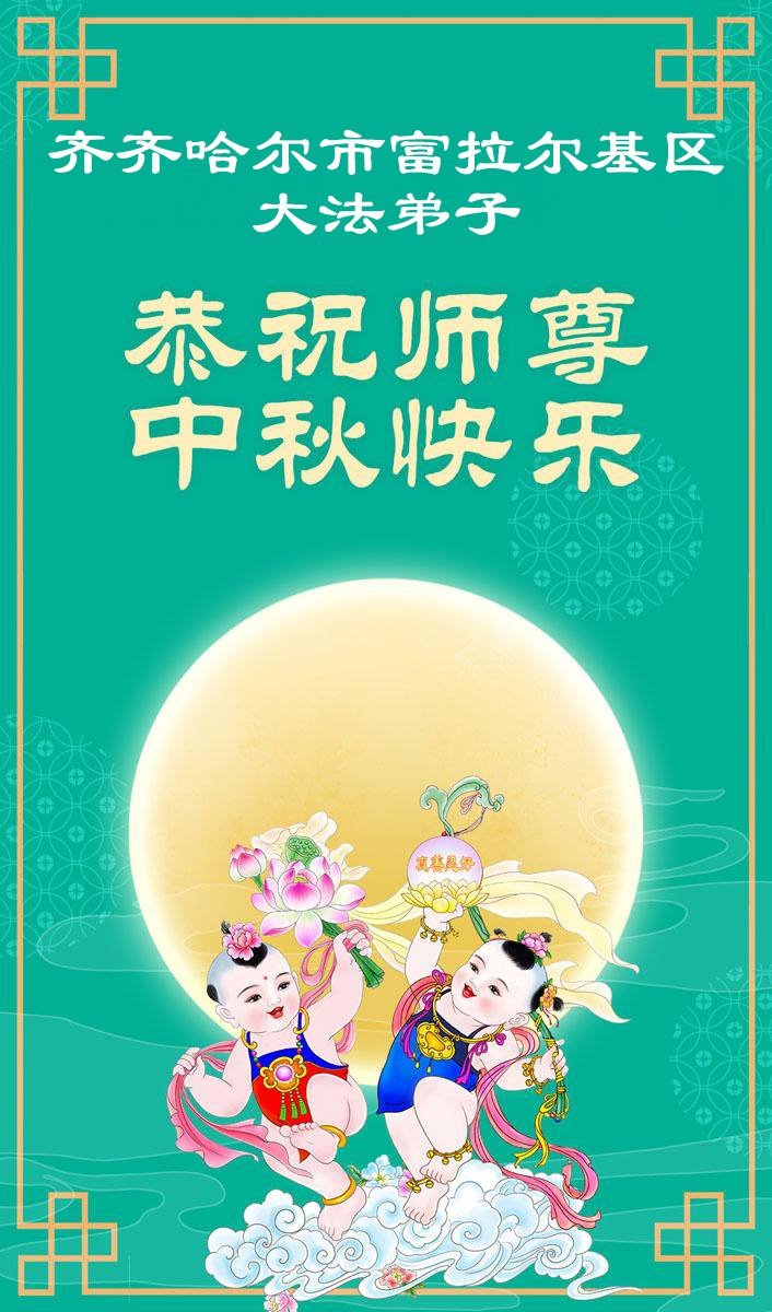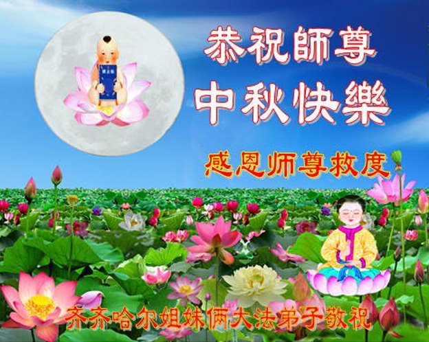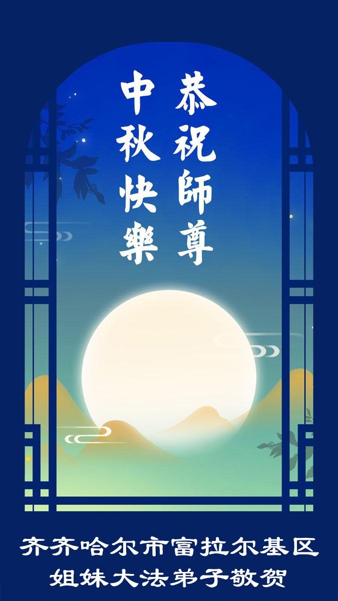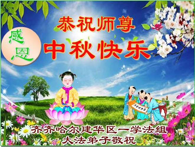 恭祝慈悲伟大的师父中秋节快乐! 弟子唯有精進实修,助师正法,救度众生,做好三件事,兑现使命,才不辜负师尊的慈悲苦度!叩谢师尊慈悲救度! 黑龙江省齐齐哈尔市姐妹俩大法弟子敬上 黑龙江省齐齐哈尔建华区一学法组大法弟子恭祝伟大师尊中秋节快乐!
