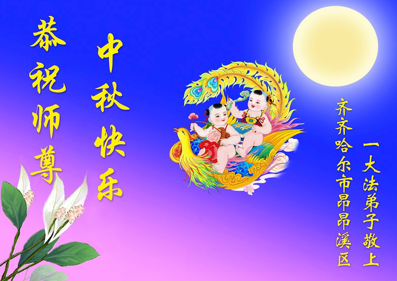 中秋至月更圆,盼师尊返中原!弟子携家人同修叩谢师尊慈悲保护! 黑龙江省齐齐哈尔市大法弟子恭祝慈悲伟大的师尊中秋节快乐!
