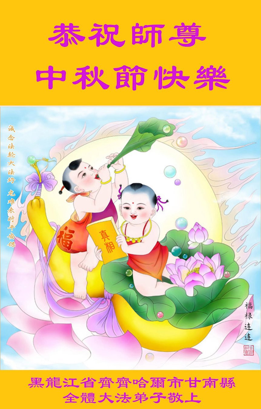 我们一定会更精進,更努力的向内找,修好自己,多救众生。 黑龙江省齐齐哈尔市建华区一学法组大法弟子敬上 黑龙江省齐齐哈尔甘南县全体大法弟子恭祝师尊中秋节快乐!