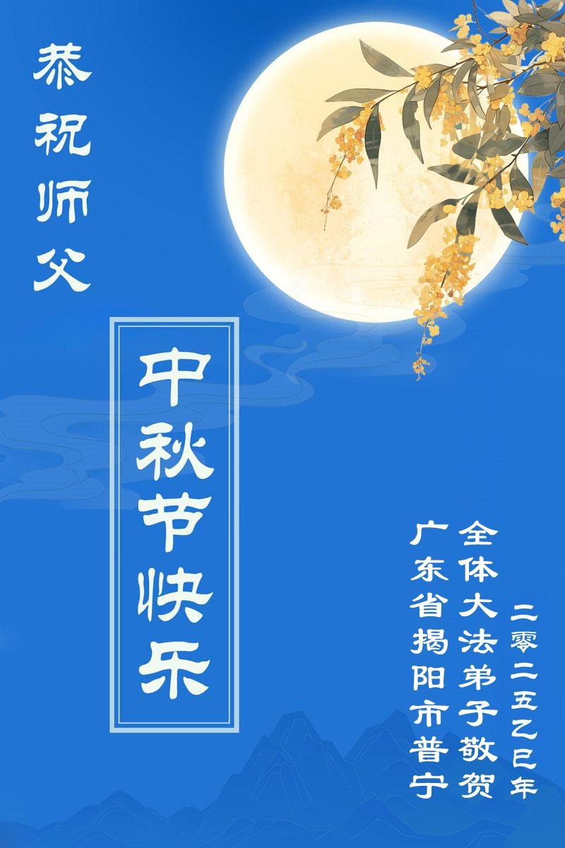 尊敬的师父您好!您辛苦了!在这中秋佳节来临之际,献上我们心中最诚挚的祝愿和感恩,恩师辛苦了!是您让我们走上修炼的道路,走出迷雾,获得新生。感谢师尊的慈悲苦度!弟子盼师尊早日回中原与大陆弟子大团圆! 广东省惠东县大法弟子敬上 二零二五年九月二十七日 广东省揭阳市普宁市一家子大法弟子恭祝师尊中秋节快乐!