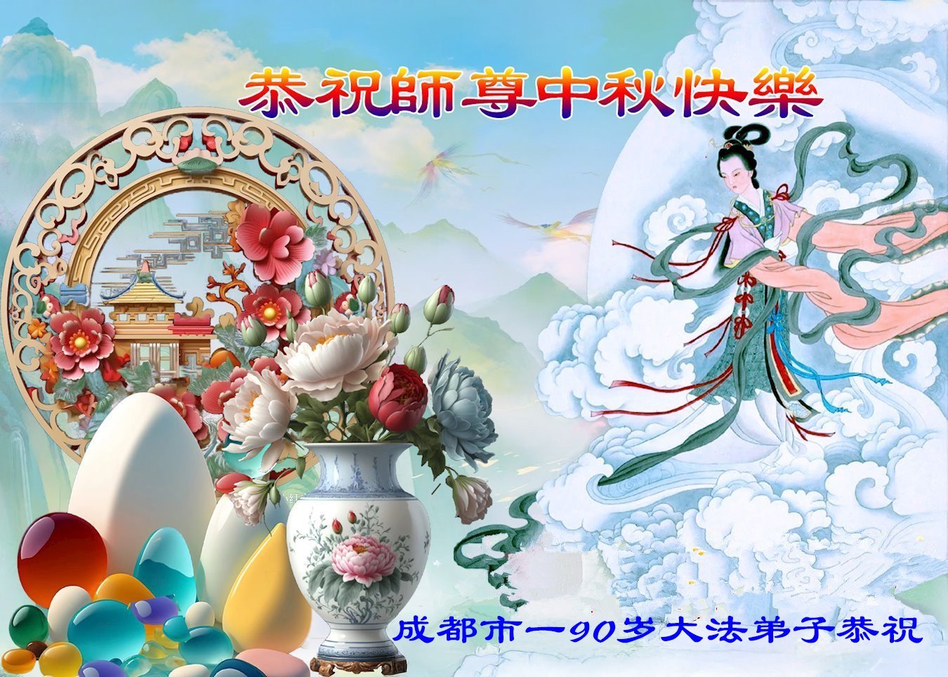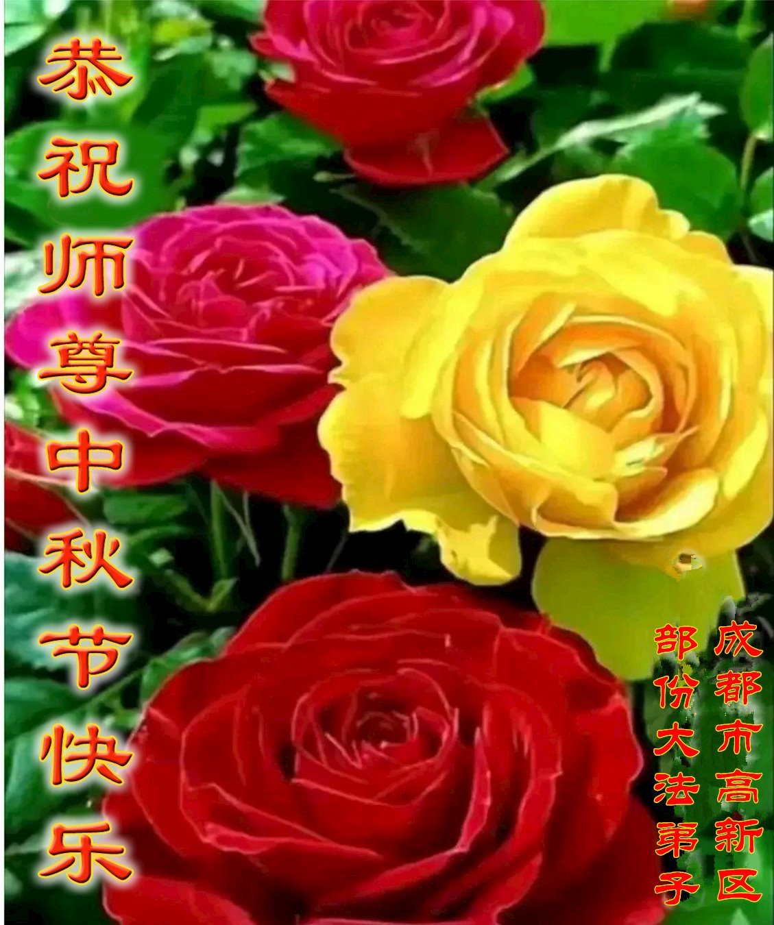 恭祝慈悲伟大的师父中秋节快乐! 四川省成都市金牛区北一环一老年大法弟子敬上 2025年9月27日 四川省成都市彭州市一大法弟子全家恭祝慈悲伟大的师尊中秋快乐!