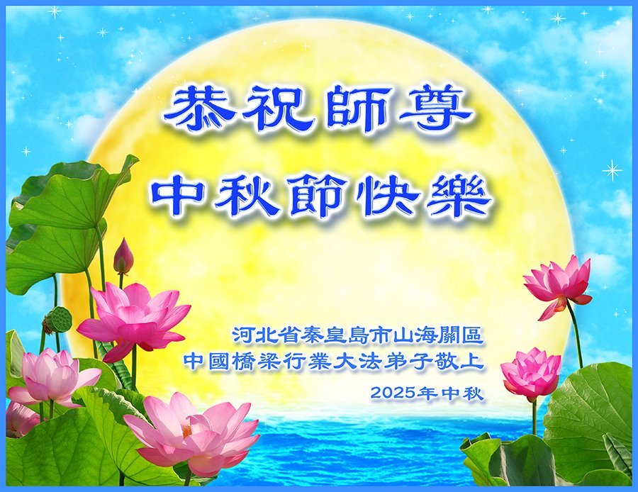 | 【明慧网二零二五年十月三日】繁星点点,中秋月圆,望月明志,遥拜恩师。中国大陆各行各业大法弟子们寄上一封封诚挚问候,表达对李洪志师尊的无限感恩。大法弟子们表示,一定学好法,修好自己,多救人,走好走正修炼的路,不辜负师尊赋予大法弟子的使命,紧随师尊法正人间。 四川省巴中市财税系统大法弟子在贺词中表示:“茫茫宇宙,芸芸众生,师尊选择我们当正法时期的大法弟子,传给我们宇宙大法,将我们满身业债洗净,使我们生命得到升华回归,师尊佛恩浩荡,弟子无比感恩!” 山东省胜利油田一炼功点大法弟子们说:“不管今后的道路还有多长、还有多难、还有多么的艰辛,弟子们都会一走到底,一修到底的。决不辜负师尊对弟子们的慈悲苦度!弟子们只想一心一意跟着师尊回到自己的真正家园。” 中国大陆人力资源、保险、教育、纺织、航空、电子信息、IT行业、音乐界、文艺界、金融、卫生、医疗、邮政、电子通信、核工业、财税、供电、疾控、能源、黄金、外贸、科技管理、银行、水利发电、会计师、油田、农垦、林业、矿业、军工、大型国企、企业、供销社、石化、建筑设计、建材、燃气、服务、丝绸、维修、水利、商业、电力、统计、铁路、机器制造、桥梁、船舶、科研、建设、粮食、市场监督、银保监、文卫、经济师、拍卖师、游乐行业、公用事业、汽车制造、律师、电商、自动化仪表,公安系统、检察院、法院、军队系统、政府职员公务员,等等,60余行业的大法弟子们叩拜师尊,恭祝师尊中秋节快乐! 中国大陆建材行业大法弟子恭祝师尊中秋节快乐!
