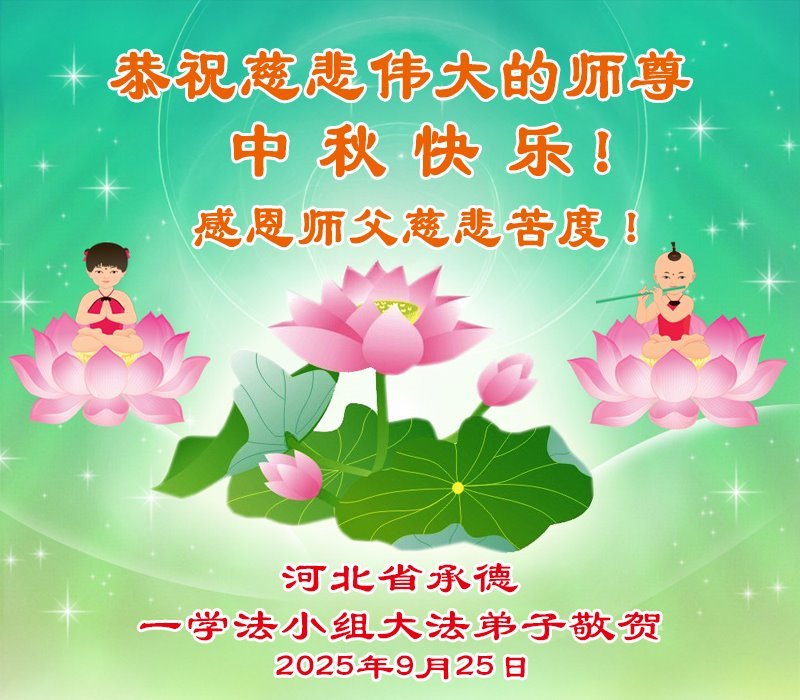 恭祝师尊中秋节快乐! 师尊您辛苦了!谢谢师尊的慈悲苦度!感恩师尊!叩拜师尊! 河北省泊头市一学法小组大法弟子敬上 二零二五年九月二十六日 河北省一大法弟子和明真相得救的丈夫恭祝慈悲伟大的师父中秋节快乐!