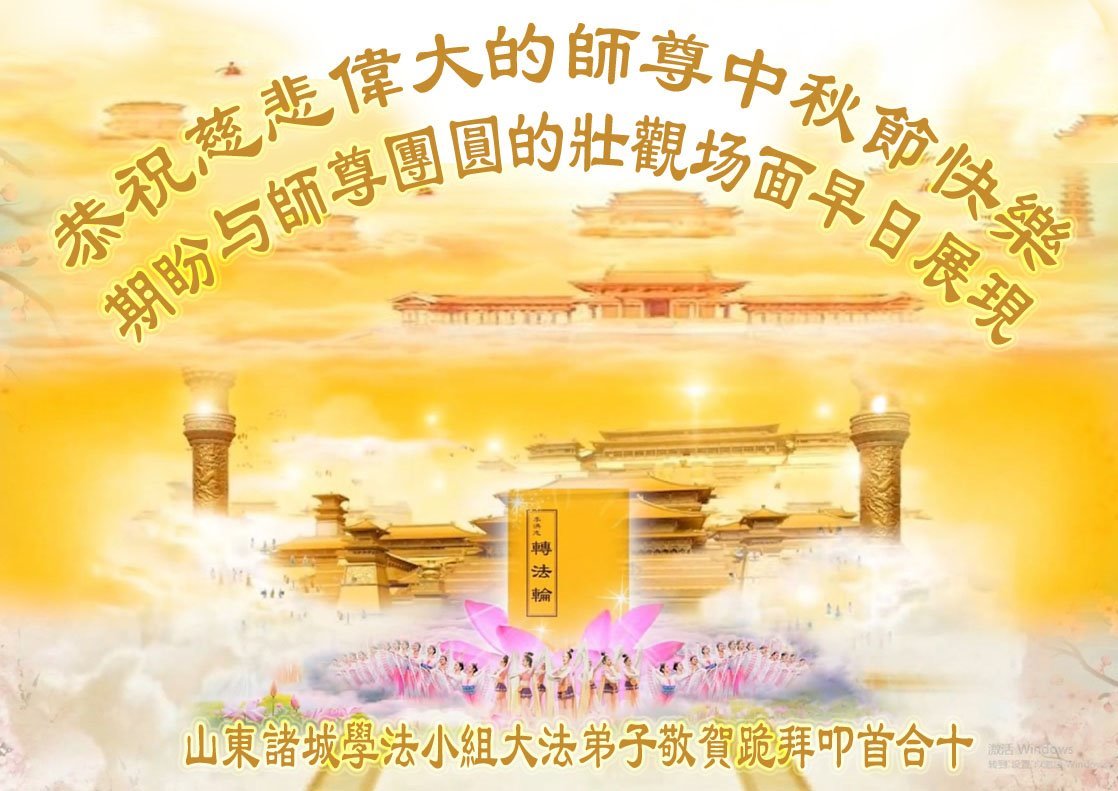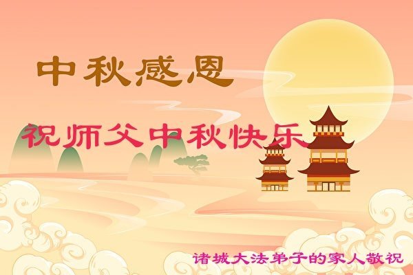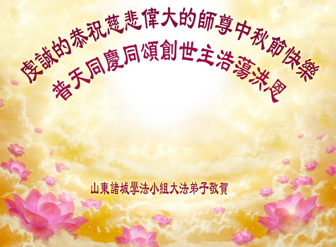 弟子无限感恩师尊的慈悲救度!在这团圆佳节来临之际,弟子非常想念师尊!盼早日结束这场持续二十六年的法难!喜迎师尊率领神韵回神州大地大团圆!在这正法的尾声,弟子牢记师尊的教诲,多学法、同化大法,越到最后越精進,做好三件事。追随师尊返回新宇洪穹!让慈悲伟大的师尊放心!叩首感恩 合十 山东省潍坊市诸城市学法小组大法弟子恭祝慈悲伟大的师尊中秋快乐!