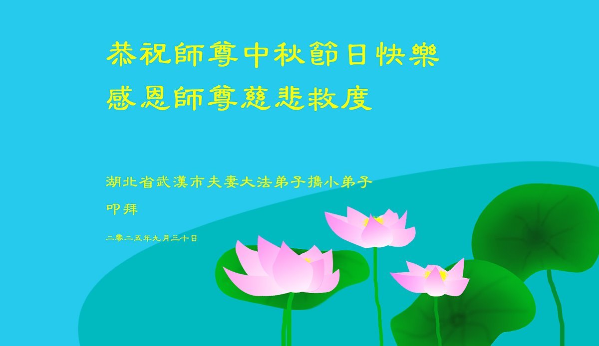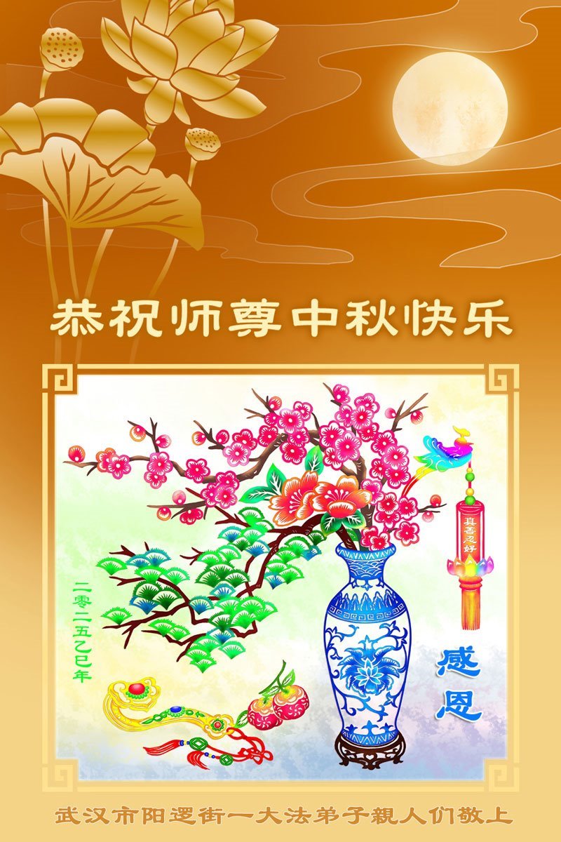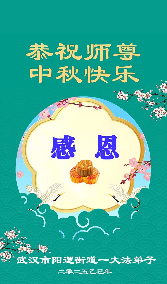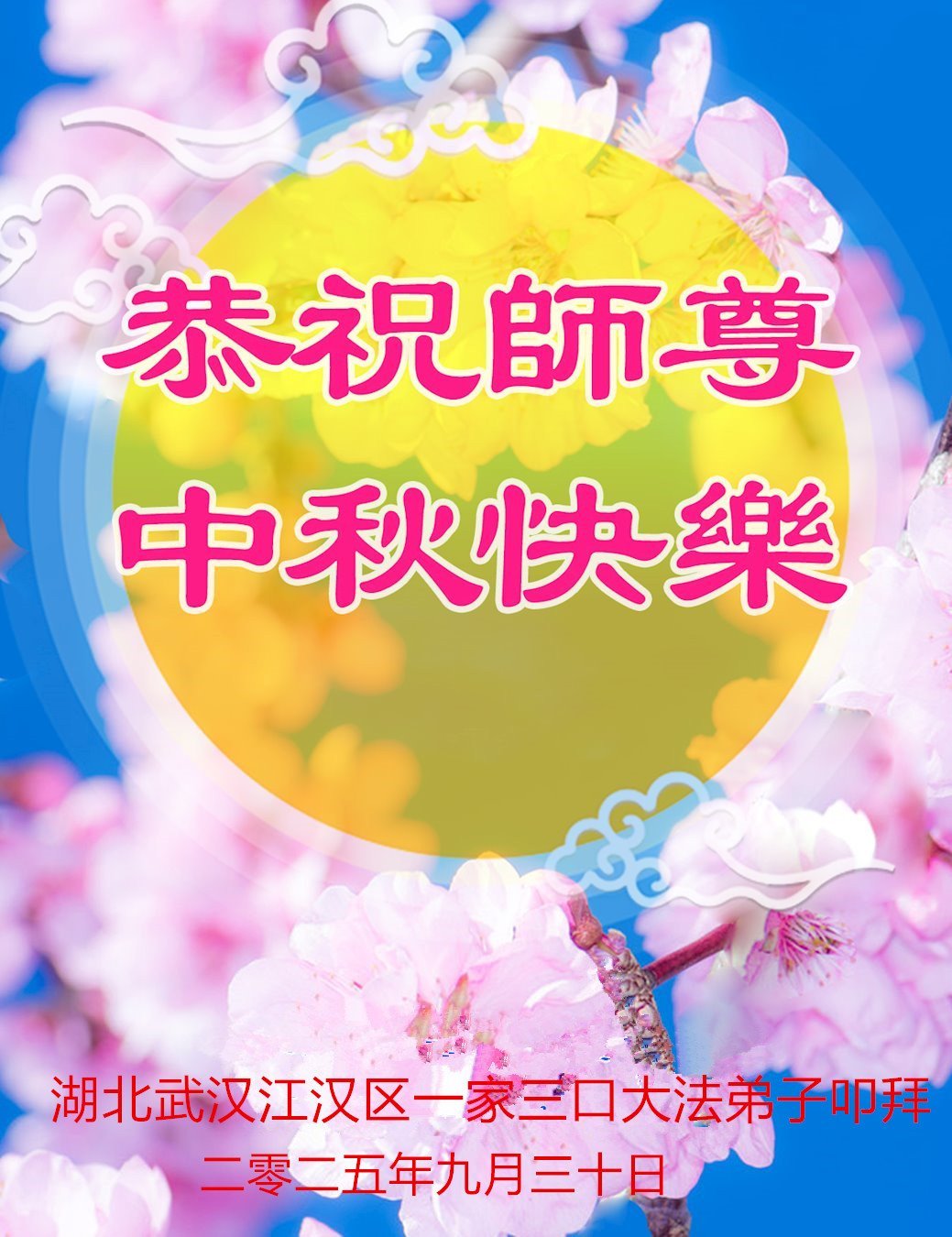 恭祝慈悲伟大的师尊中秋节快乐! 师尊您辛苦了!弟子感恩师尊您的慈悲的救度与洪大的恩赐,感恩师尊您的慈悲保护和指引,让我们踏上了修炼法轮大法的返本归真的金光大道。除了感恩再感恩!弟子一定要精進实修,做好三件事,圆满随师还。 湖北省武汉市大法弟子叩拜 二零二五年九月二十九日 湖北省黄冈市麻城市一大法弟子及家人恭祝师尊中秋快乐!