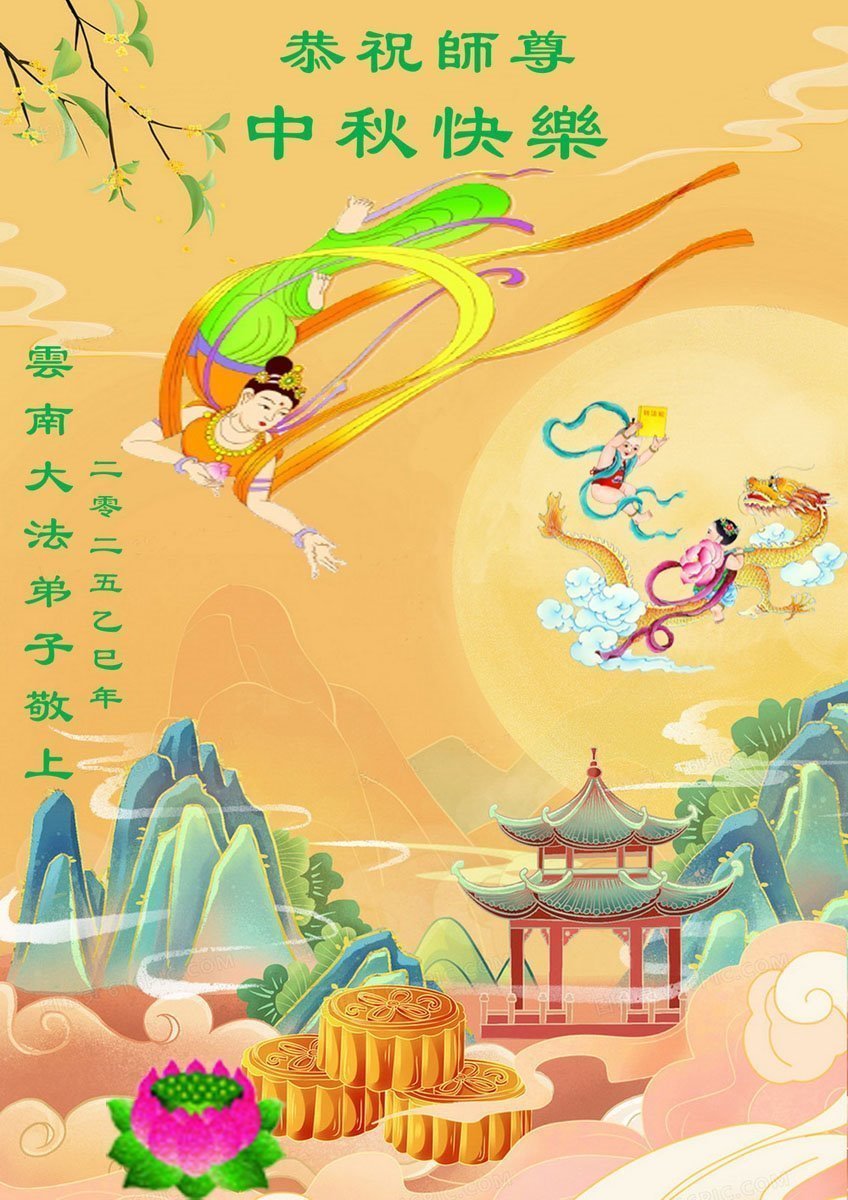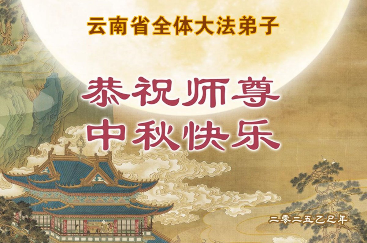 师尊辛苦了,感恩师尊慈悲苦度!云南大法弟子决心紧跟师尊正法進程,做好大法弟子的三件事,学好法,多学法,实践法,向民众多讲真相,讲好真相,多救人,兑现史前誓约,让师尊放心! 云南青年大法弟子恭祝师尊中秋节快乐!