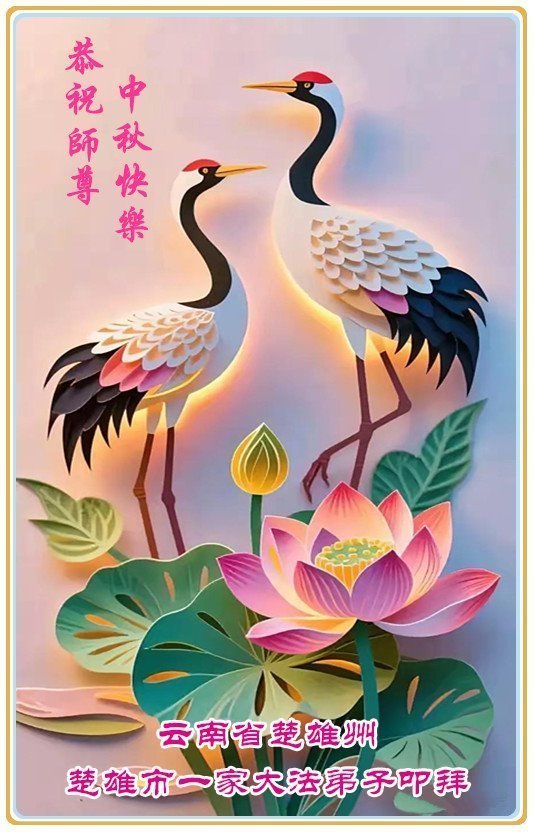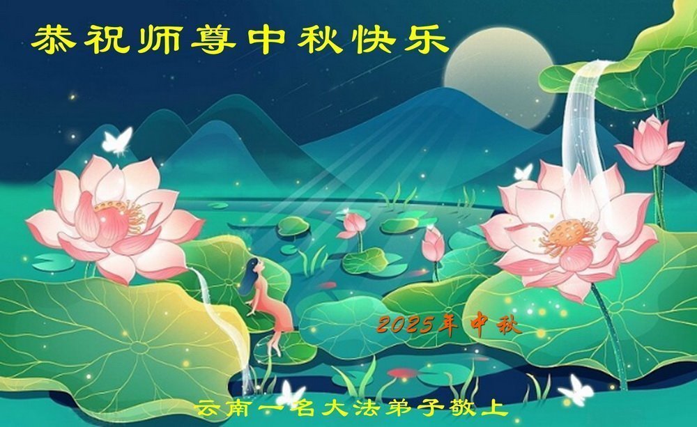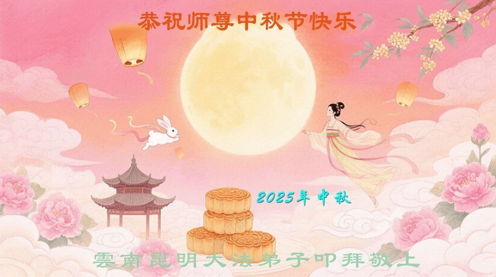 慈悲的恩师好,我们日夜想念您啊!弟子明白,只有修好自己,做好三件事,回归家园时就能见到您!请师父放心,弟子无论遇到什么都不会退却!勇往直前修到底! 云南省昆明一老年大法弟子及女儿一家敬上 二零二五年十月一日 云南省昆明一老年大法弟子恭祝师尊中秋节快乐!