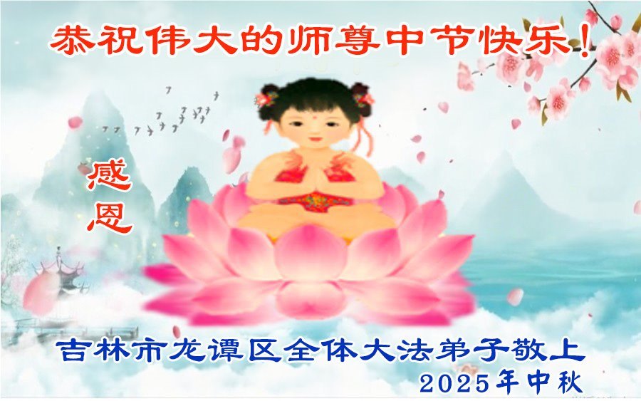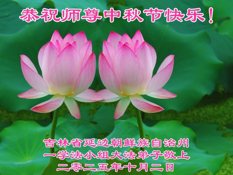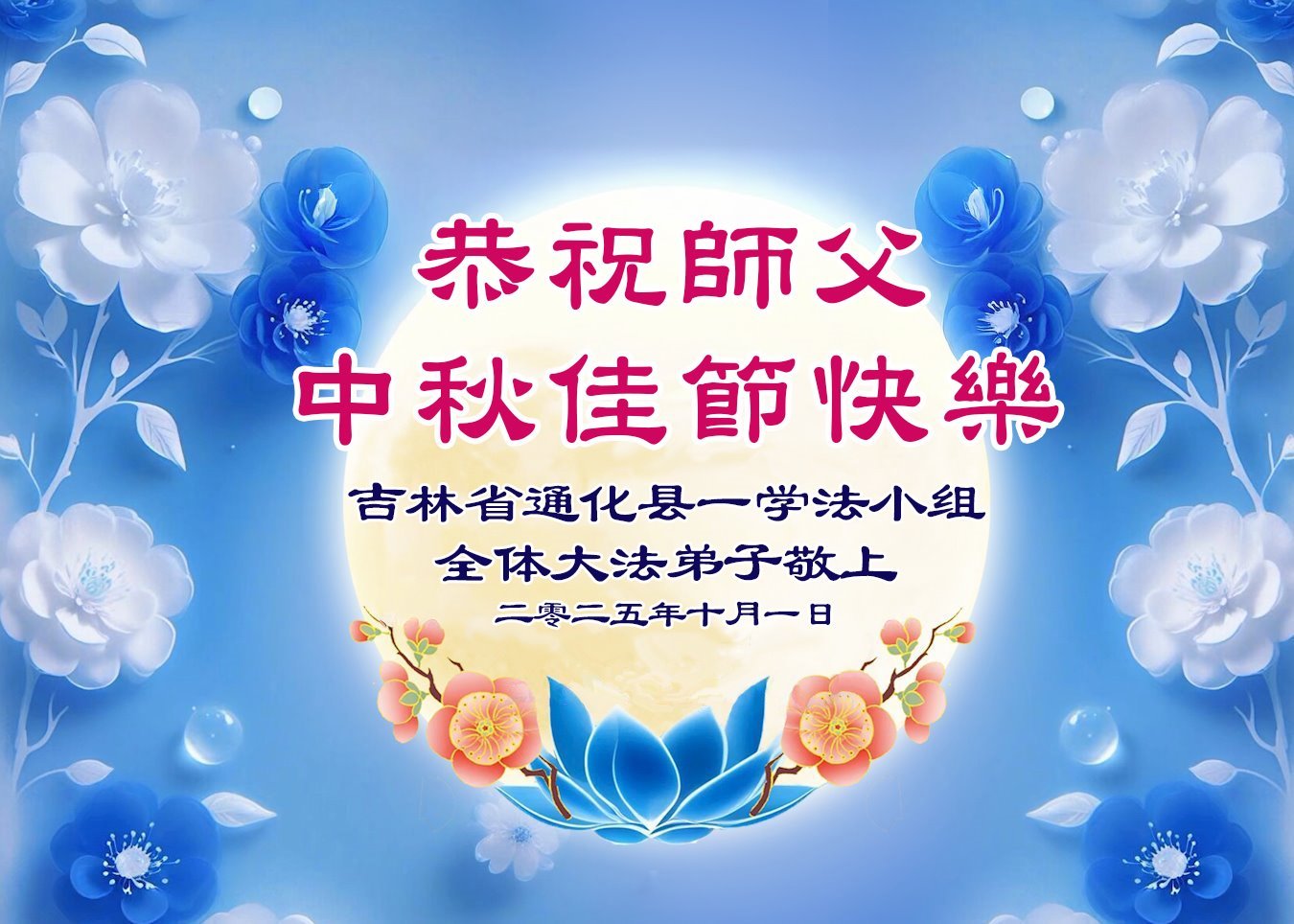 在这个合家团圆的节日里,弟子非常想念师尊,弟子在大法中受益,成长、成熟,都是师尊您的点悟、保护、加持,使弟子走到今天,不知您为弟子操了多少心,弟子感恩再感恩! 法轮大法好!真善忍好! 吉林省农安一大法弟子代表家人敬上 二零二五年十月一日 吉林省延边朝鲜族自治州一学法小组大法弟子恭祝师尊中秋节快乐!