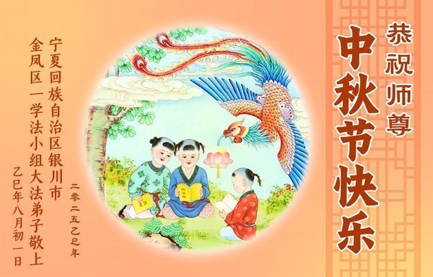 恭祝师尊中秋快乐! 感恩师尊传大法, 弟子如愿找到家, 回家路上魔难阻, 真修实修邪魔怕。 感恩师尊传大法, 佛光普照亿万家, 众生高诵真善忍, 举世同乐德升华。 宁夏回族自治区银川市金凤区大法弟子敬上 二零二五年九月二十五日 宁夏回族自治区银川市金凤区一学法小组大法弟子恭祝师尊中秋快乐!
