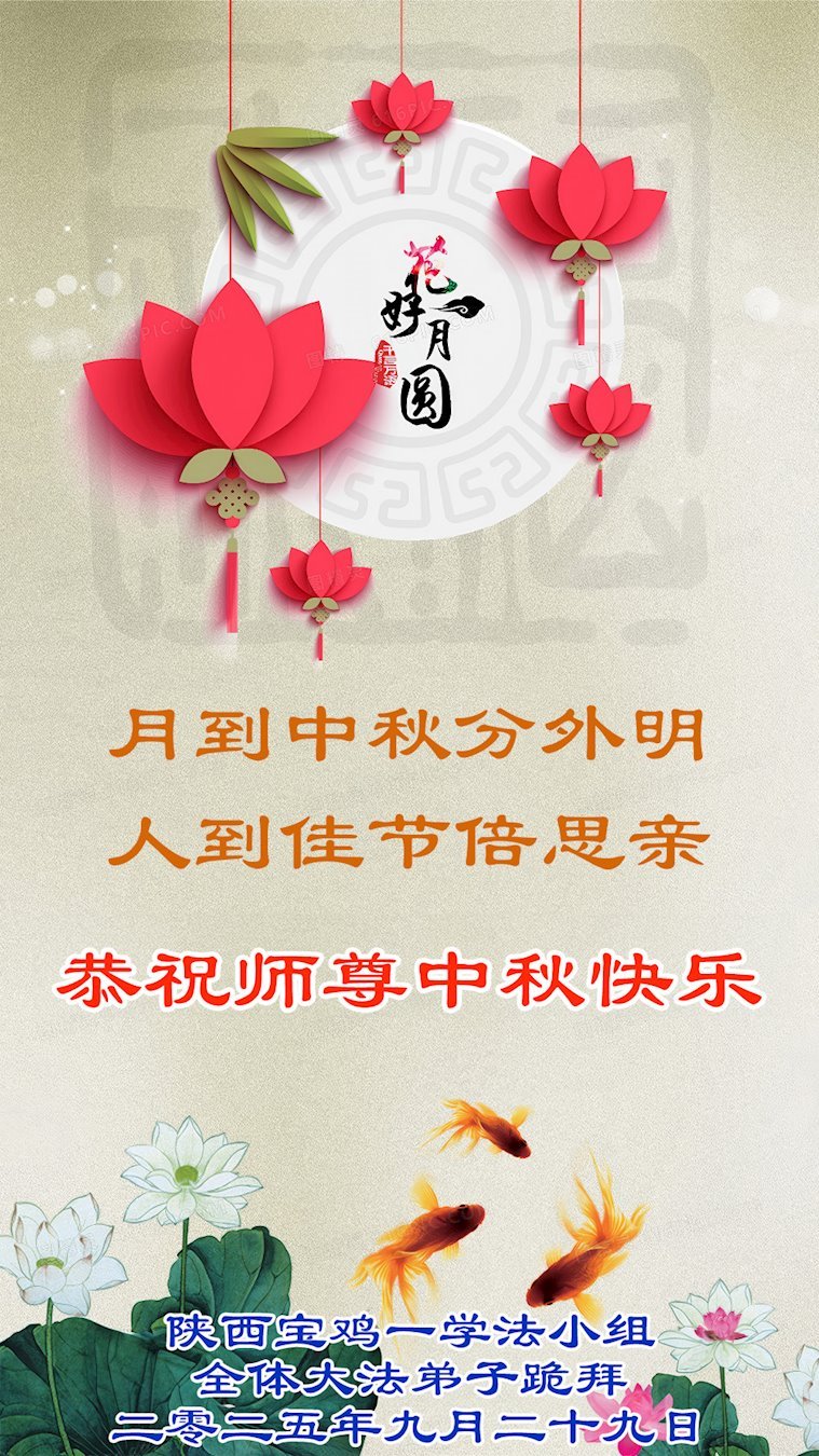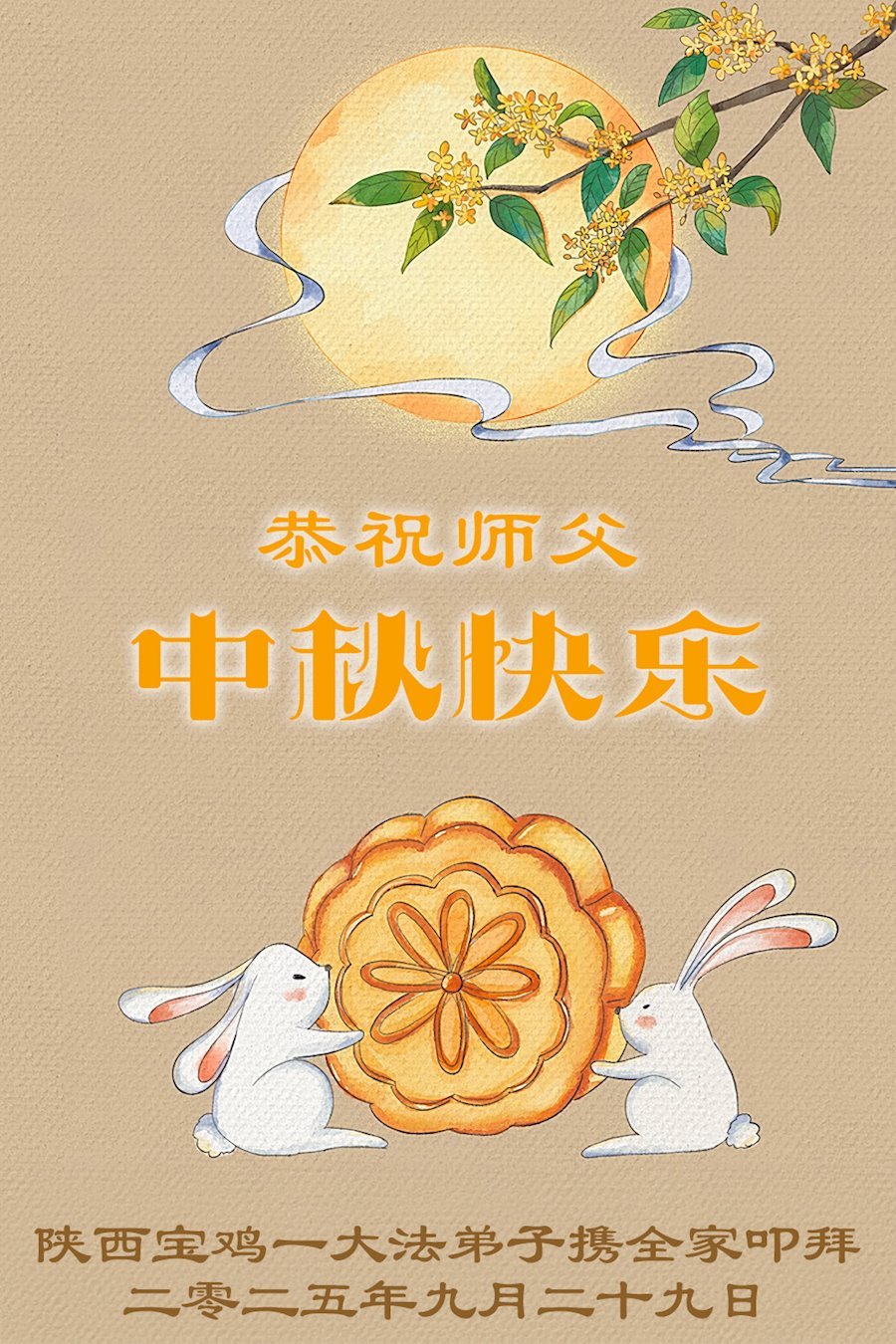 恭祝师尊中秋快乐!月到中秋分外明,人到佳节倍思亲,师父您为弟子操尽了心,师父您真的辛苦了!弟子一定勇猛精進,兑现誓约,完成使命,跟师父回家。 陕西宝鸡一学法小组全体大法弟子跪拜 二零二五年九月二十八日 陕西省宝鸡一大法弟子携全家恭祝师父中秋快乐!