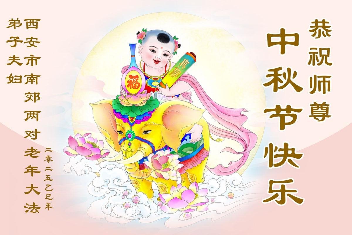 恭祝伟大师尊中秋快乐! 西安市南郊两对老年大法弟子夫妇敬上 二零二五年九月三十日 陕西省西安北郊一家大法弟子恭祝师父中秋快乐!