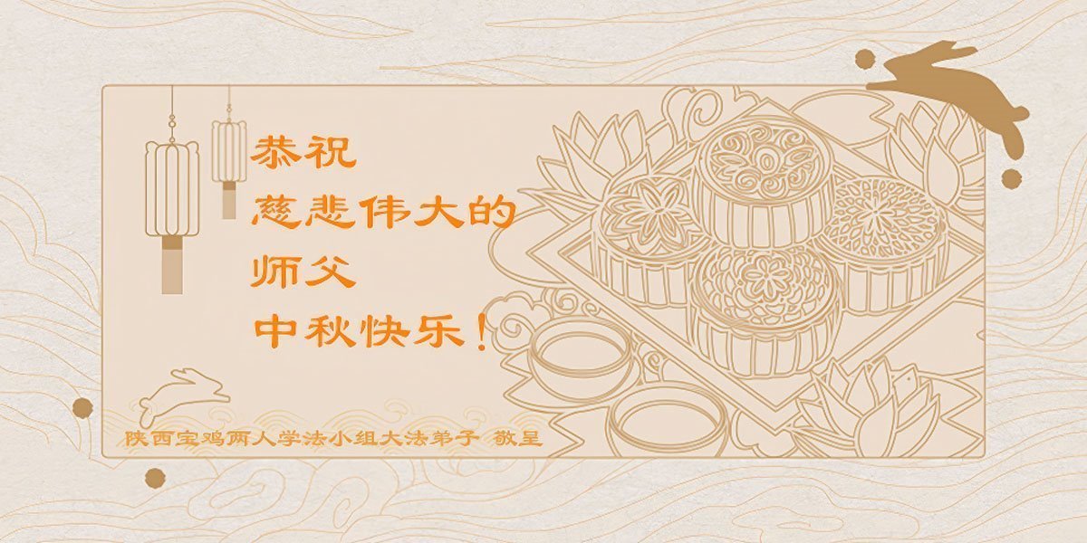 师父您辛苦了!每逢佳节倍思亲,中缘故国大法弟子想念您,盼望师父早回中原与弟子们团聚。我们将一如既往的做好大法弟子该做的事。我们大陆所有大法弟子将与全世界大法弟子共同珍惜与大法的万古圣缘,真正走好、走完师父安排的正法修炼之路,履行使命,不辜负伟大师尊对弟子生生世世的保护与救度,兑现神圣誓约! 弟子叩拜师父! 陕西省宝鸡市渭滨区一学法小组大法弟子恭祝师父中秋节快乐!
