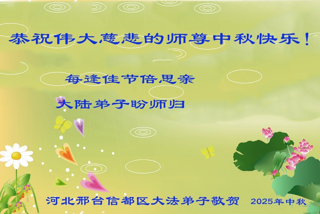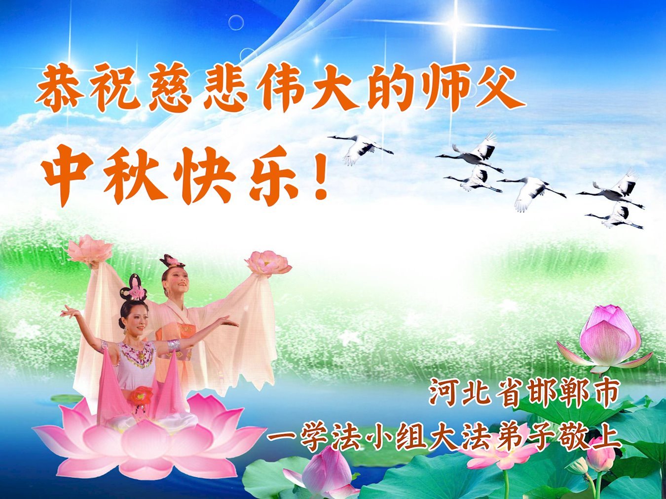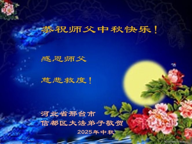 恭祝慈悲伟大的师尊中秋节快乐! 感恩师尊的慈悲救度!叩谢师恩浩荡!弟子要正念正行,完成大法弟子的历史使命。 河北省衡水市大法弟子敬上 河北省邢台市大法弟子恭祝师尊中秋节快乐!