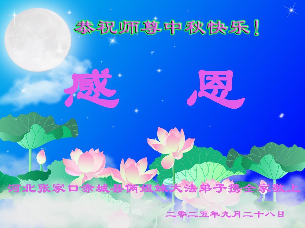 河北张家口赤城县俩姐妹大法弟子携全家恭祝师尊中秋快乐!