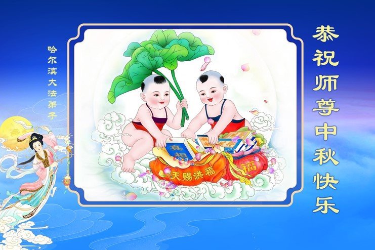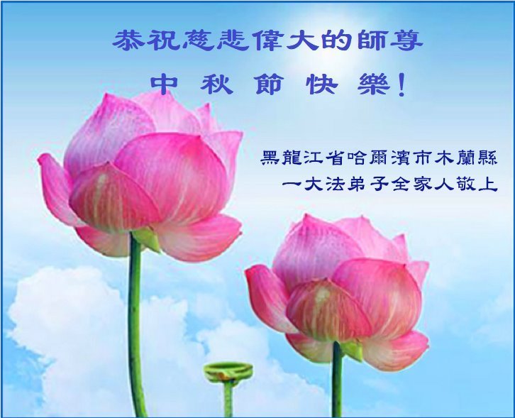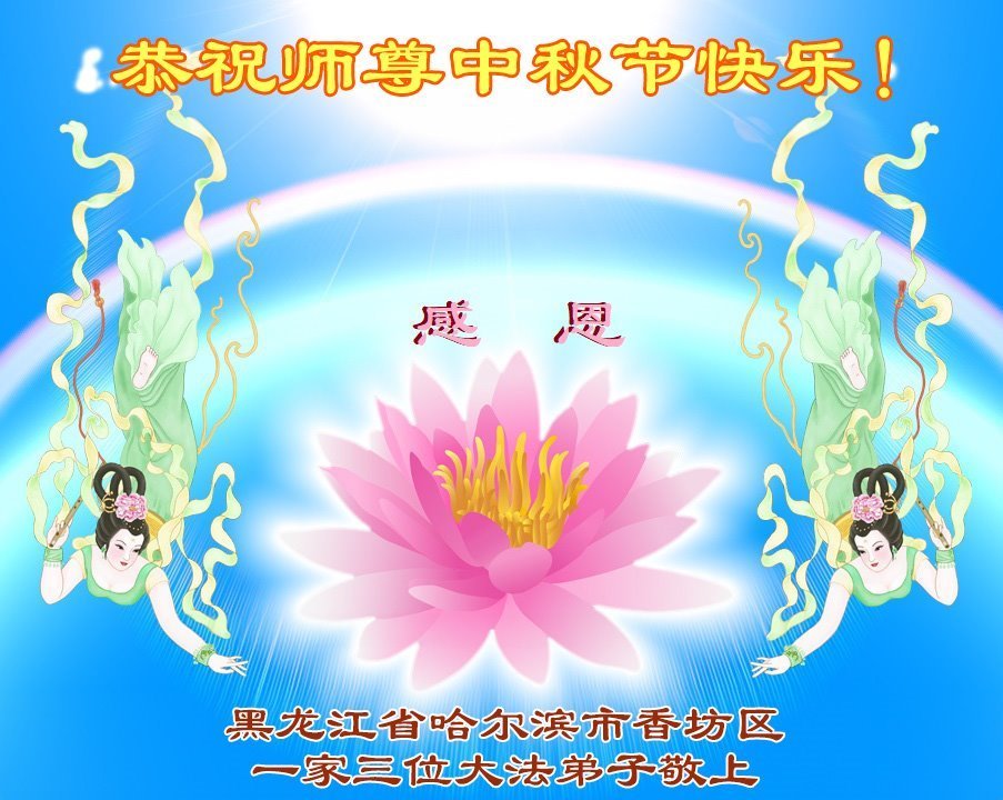 师尊,弟子在您的保护下已经進入了而立之年。从一个懵懂无知的少年学员成长为一名青年大法弟子。在您的保护下,我由一名品学兼优的好学生成长为一名躬耕于教坛的好老师。弟子今后一定多学法、静心学法,做好三件事。最后请允许我代表我的妻子、岳父、岳母向师尊问候中秋快乐!我们盼望师尊回到中国大陆,弟子堂堂正正地与师尊相见的那一刻。 黑龙江省哈尔滨三人学法小组大法弟子恭祝师尊中秋快乐!