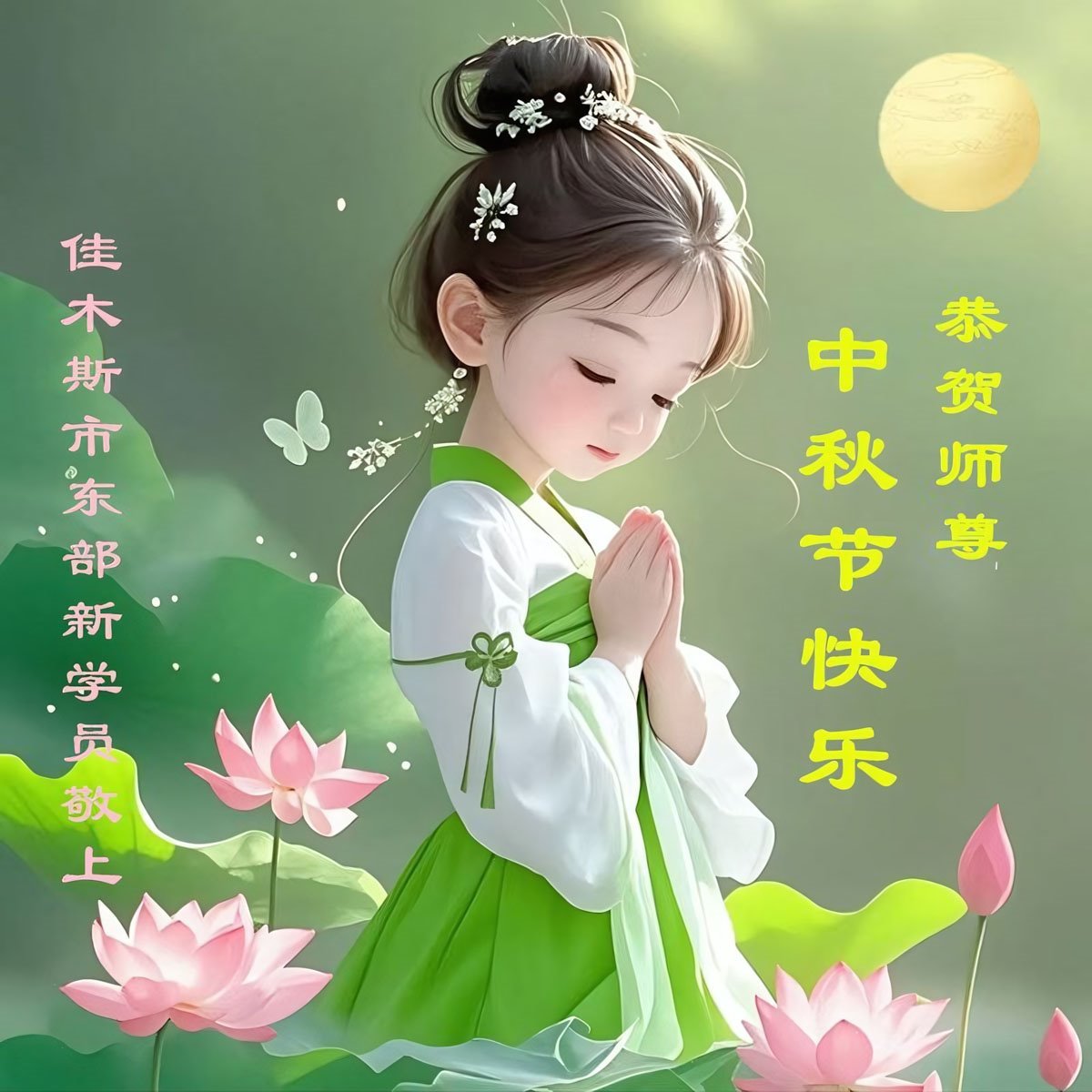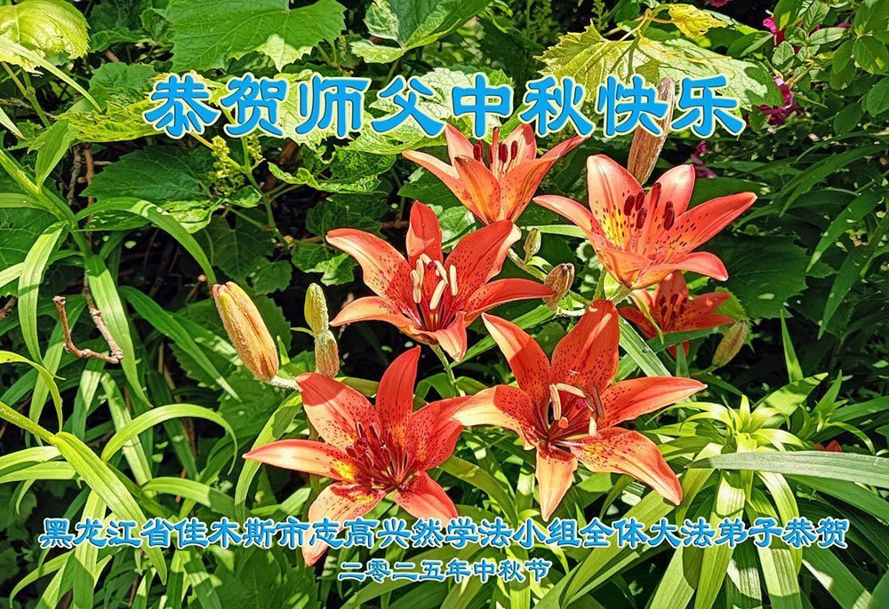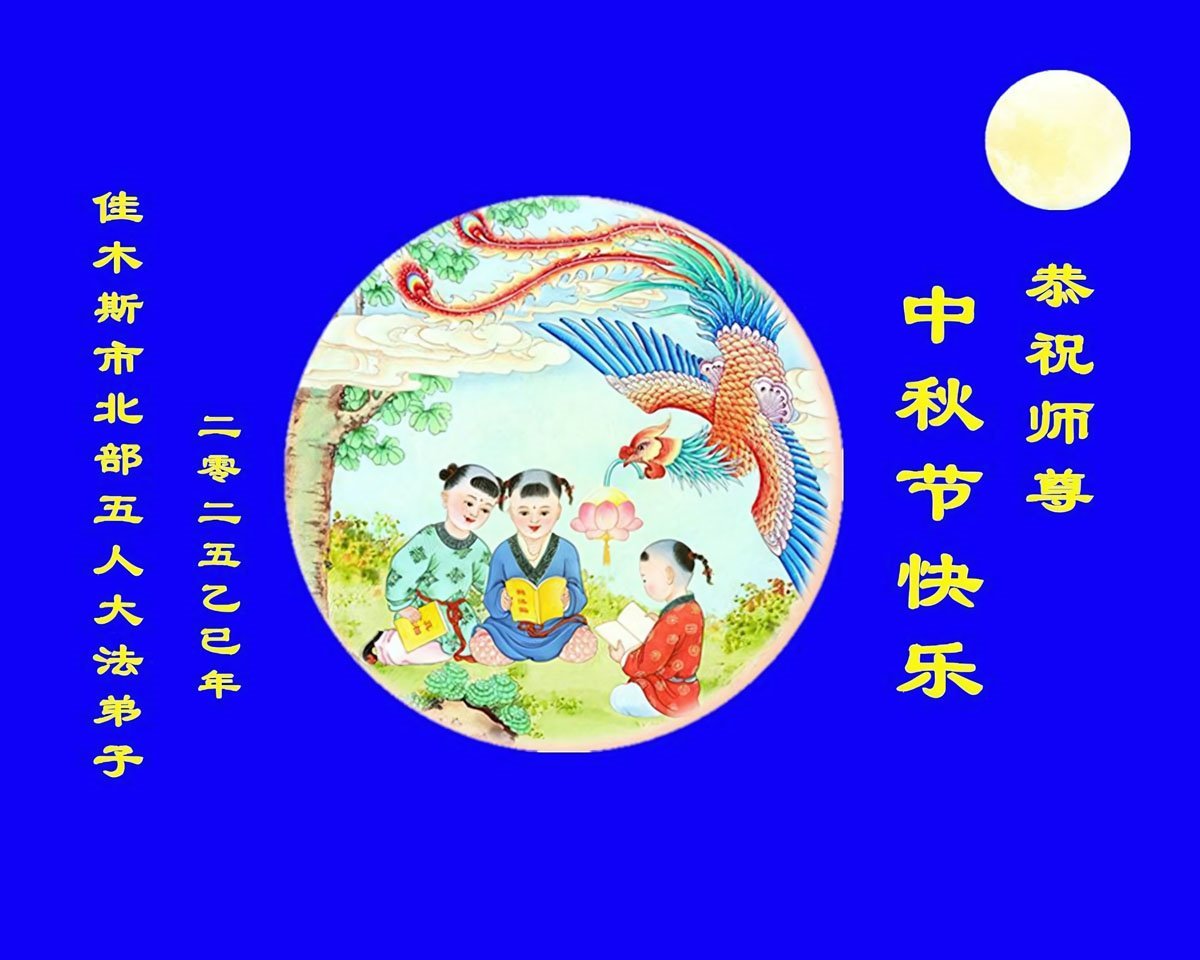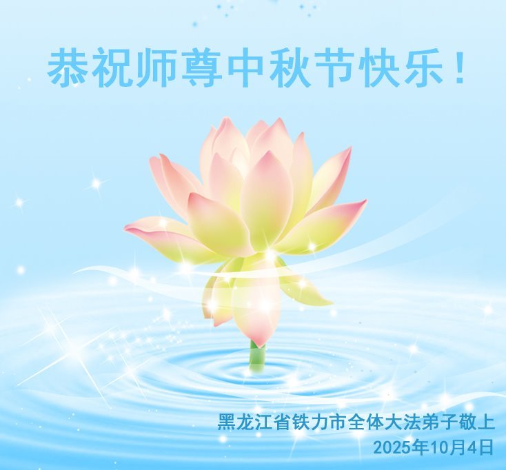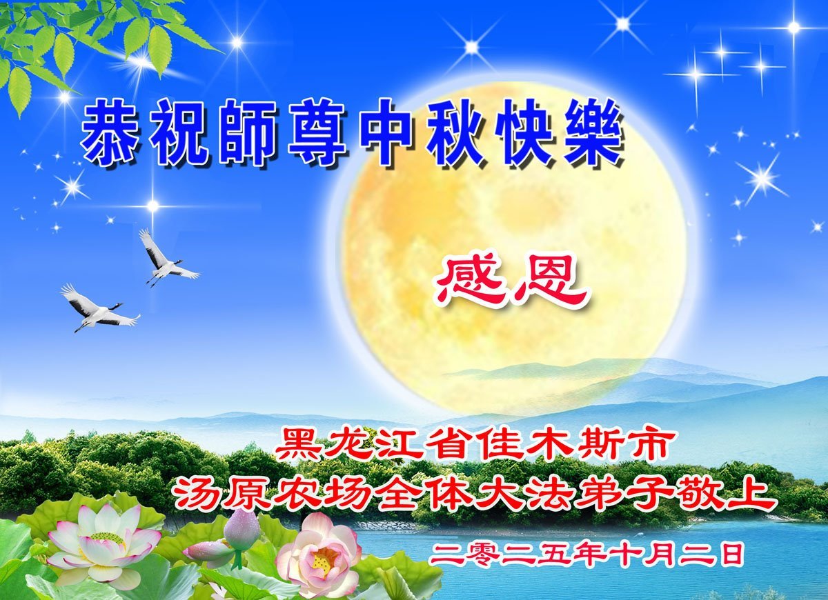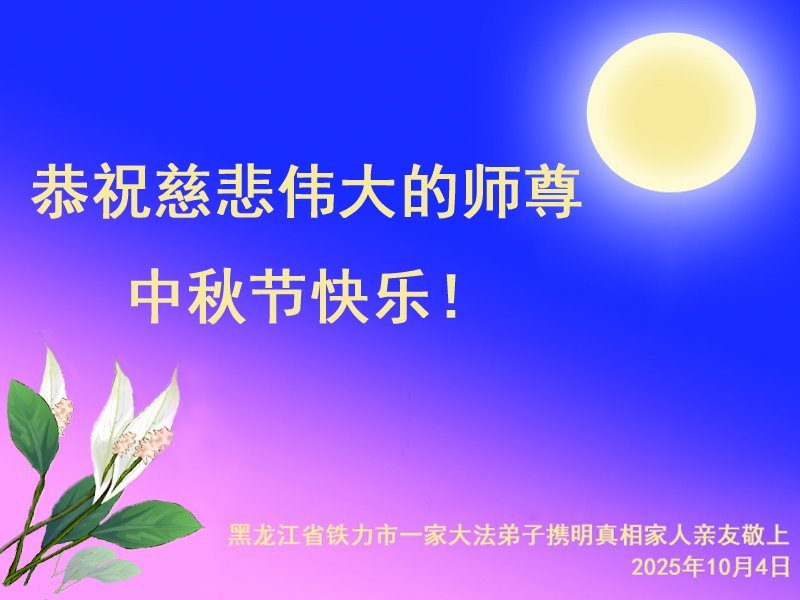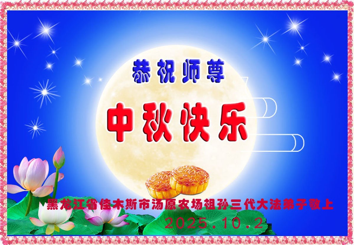 恭祝师尊中秋节快乐! 感谢师尊慈悲救度!弟子会做好三件事,多救人,兑现誓约。 黑龙江省佳木斯市西片一学法小组大法弟子敬上 二零二五年十月四日 黑龙江省佳木斯市大法弟子恭祝师尊中秋快乐!