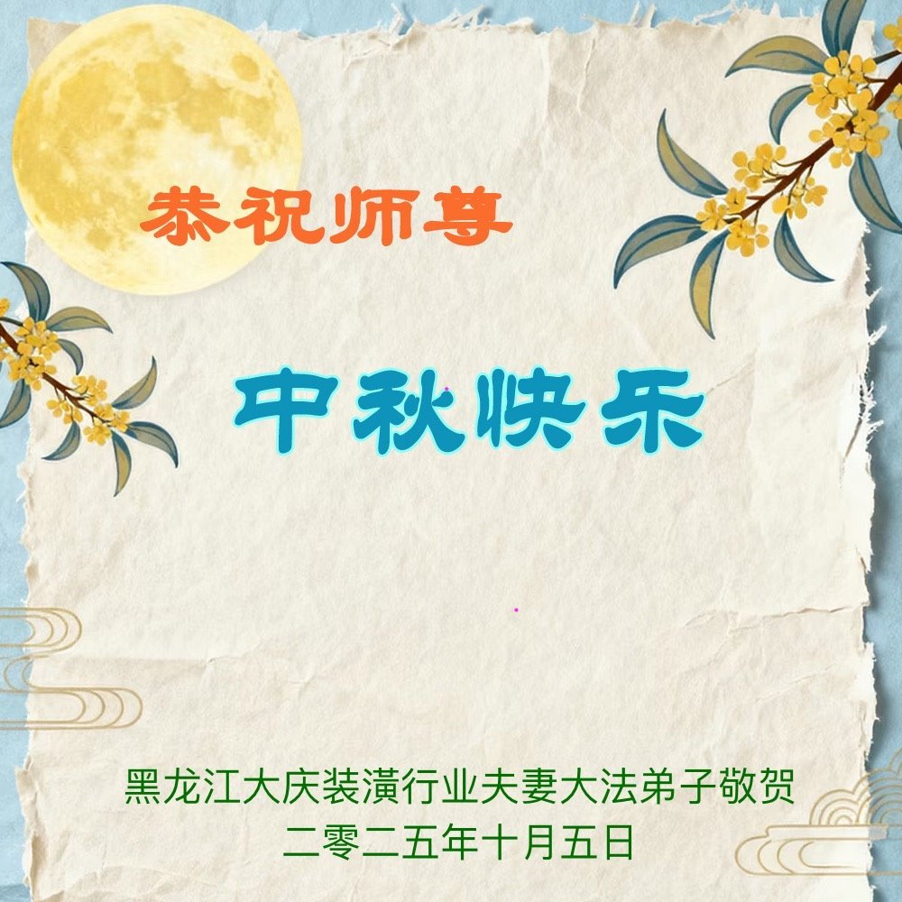 恭祝师尊中秋节快乐! 师父您好!师父辛苦了!谢谢师父慈悲救度! 黑龙江大庆滨海花园大法弟子 二零二五年十月三日 黑龙江省大庆大法弟子恭祝师尊中秋节快乐!