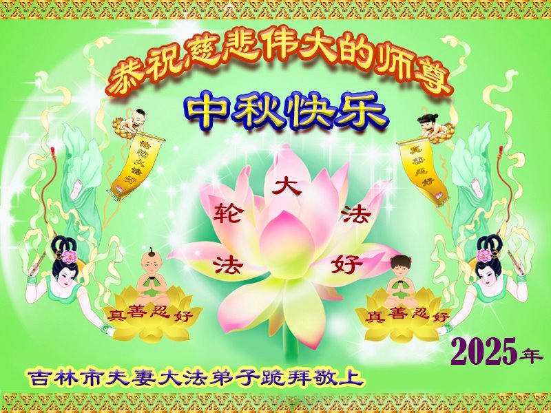 恭祝法轮大法师父中秋快乐! 我们诚念〝法轮大法好!真善忍好!〞得福报,家庭和睦,收入稳定,老人长寿健康,儿女善良孝顺,双双考入大学,毕业即顺利参加工作。感恩大法师父对众生的无量慈悲与付出!期盼法轮大法能够早日在中国自由修炼,法轮大法师父早日回到中国! 法轮大法好!真善忍好!常念得福报。 中国吉林明真相得福报的世人家庭及亲友敬上 二零二五年十月 吉林一明真相得福报的世人家庭及亲友恭祝法轮大法师父中秋快乐!