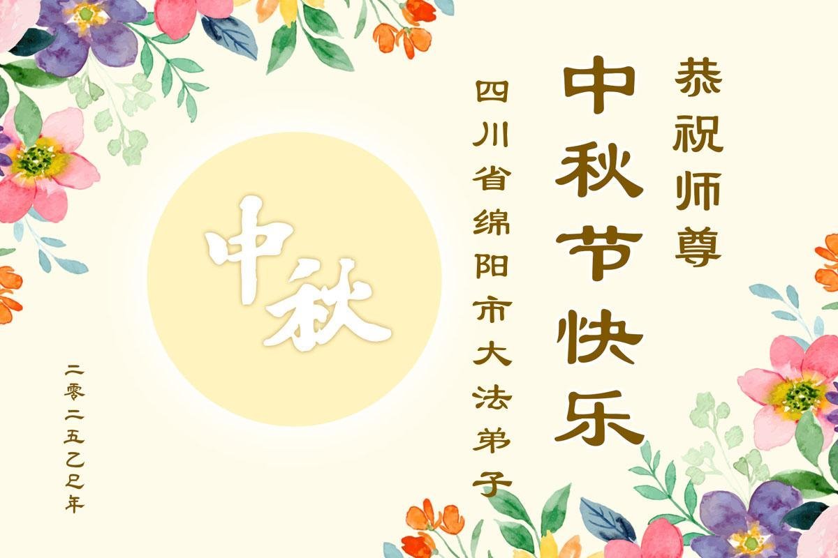 大法弟子想念师父!感谢师父把我们洗净,教我们按真善忍宇宙特性做人,在哪里都要做一个好人,在家庭、在单位、在社会,无论在任何环境中都要实践真善忍。弟子们一定勇猛精進,利用好师父用巨大承受延续来的这一刻值千金、值万金的宝贵时间,抓紧同化大法,真修、实修,抓紧机缘把大法的美好告诉被谎言毒害的可贵中国人,在大淘汰中争取助师多救一个是一个。盼望师父早日回国! 四川省绵阳市大法弟子恭祝师父中秋节快乐!