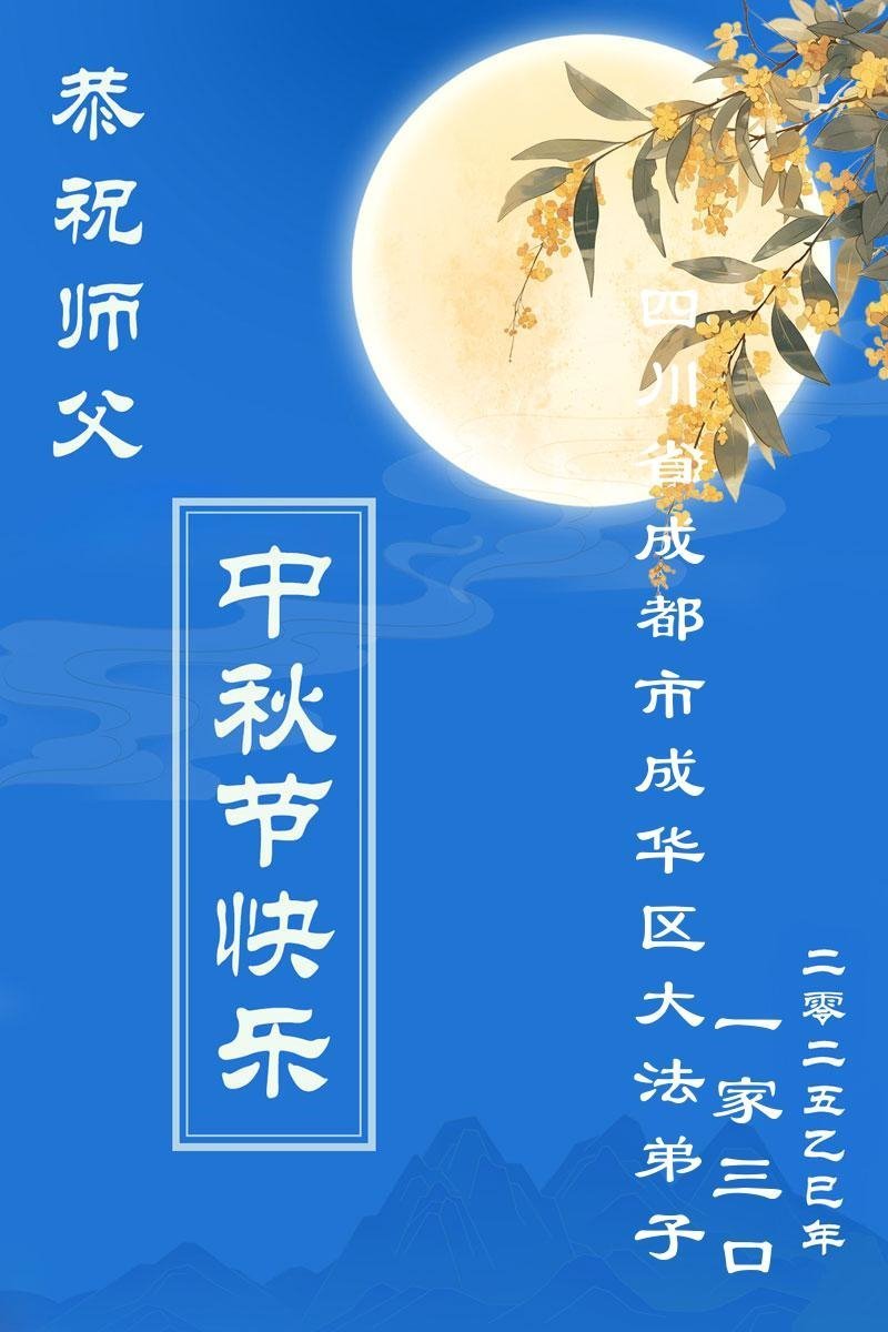恭祝师尊中秋节快乐!师父您辛苦了!感谢师父的巨大付出!合十。 四川省成都市成华区大法弟子一家三口敬上 二零二五年十月三日 四川省成都大法弟子恭祝慈悲伟大的师尊中秋节快乐!