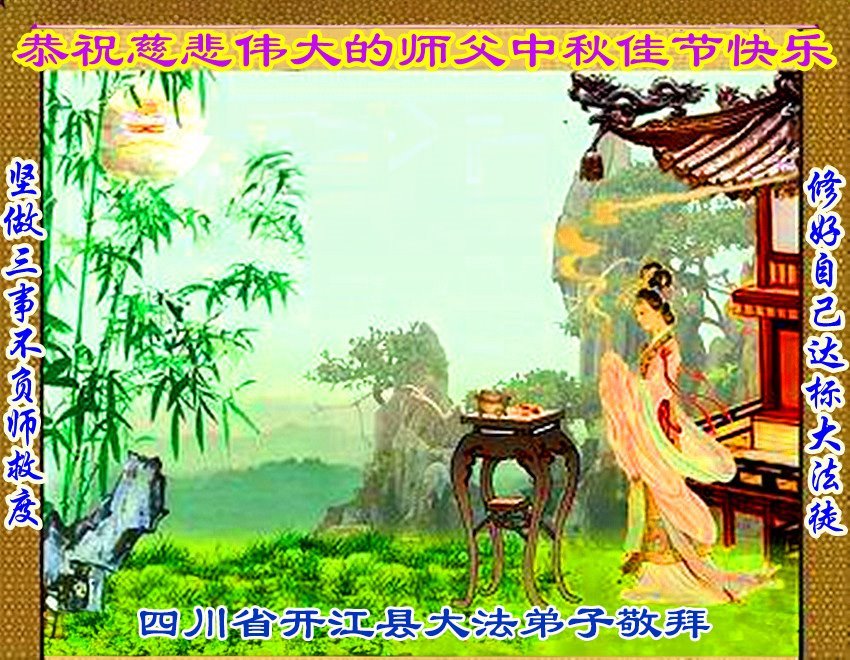 尊敬的师父您好,弟子第一次在明慧网给您发贺卡,心中激动万分。弟子一定勇猛精進,救度更多的众生。弟子叩首! 四川遂宁北山大法弟子恭祝师父中秋快乐!