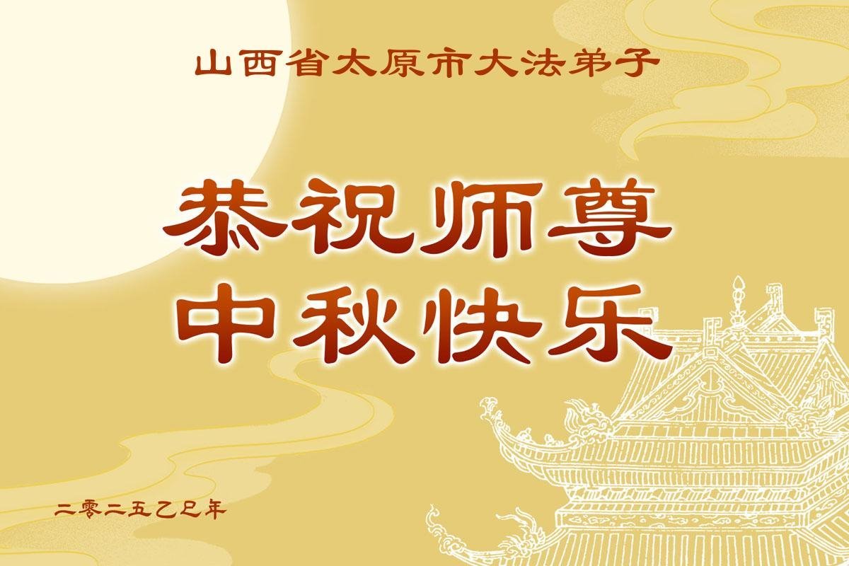 全体弟子精進实修,解体共产邪魔,以报师恩。弟子合十叩首! 山西省太原市大法弟子恭祝师尊中秋节快乐!
