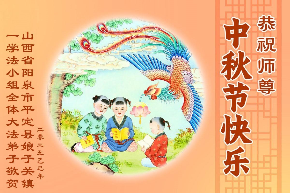 恭祝师尊中秋节快乐! 我们小组一定听师尊的话,向内找实修自己,多救人,跟师尊回家。跪拜师尊! 山西省阳泉市平定县娘子关镇一学法小组全体大法弟子敬上 二零二五年十月四日 山西省临汾市汾西县大法弟子恭祝师尊中秋快乐!