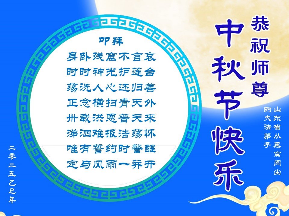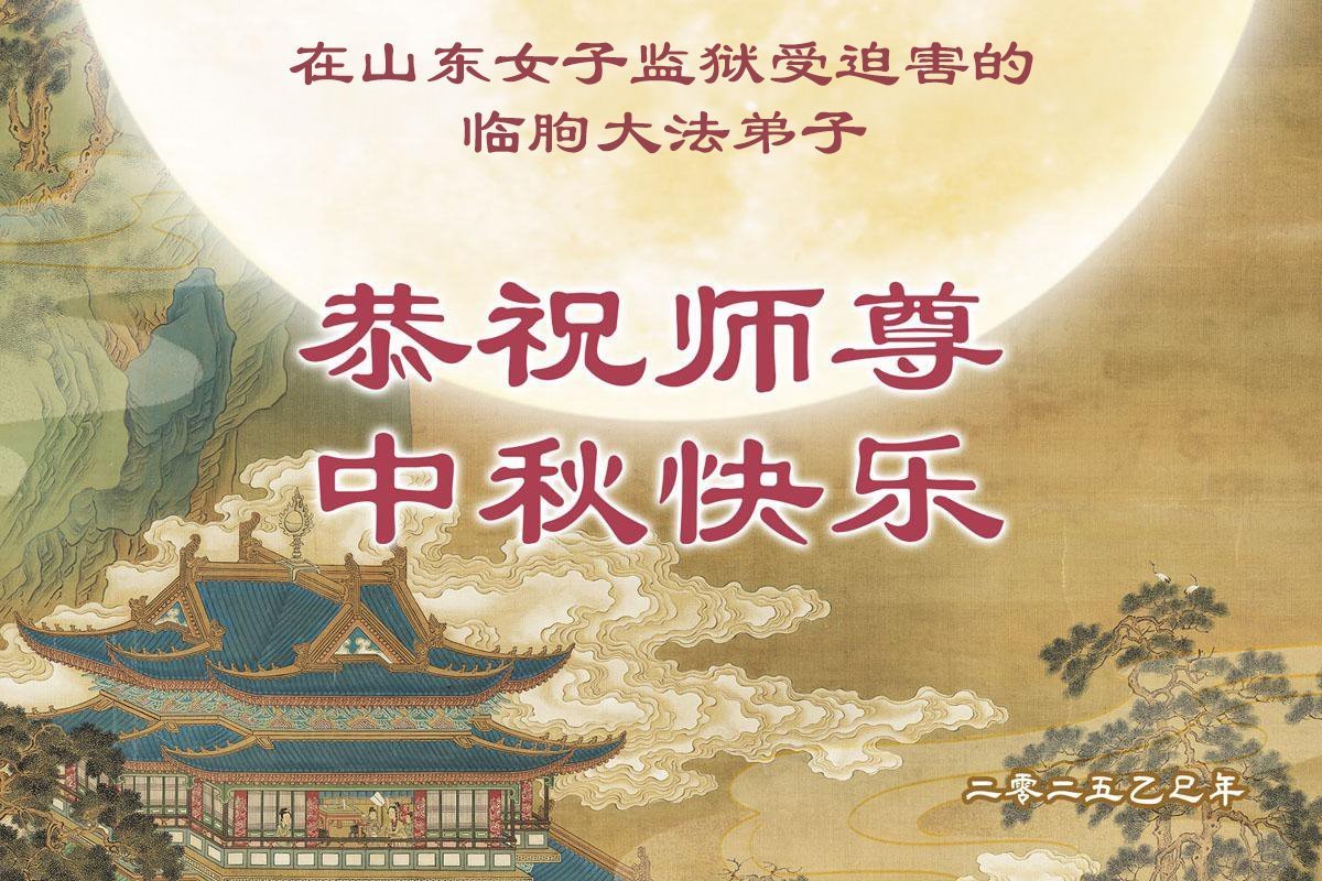 恭祝慈悲伟大的师父中秋节快乐! 感谢师父,感谢大法!感恩慈悲伟大的师父一路的救度与看护,我们才能平稳的走到今天,做好大法弟子应该做的三件事。在今后的日子里,我们要更加精進再精進,学好法,修好自己,多救人,不辜负师父和众生的期望,完成历史使命,圆满跟师父回家。 山东省龙口市三名大法弟子敬上 二零二五年十月四日 在山东省女子监狱遭受迫害的临朐县大法弟子恭祝师尊中秋节快乐!