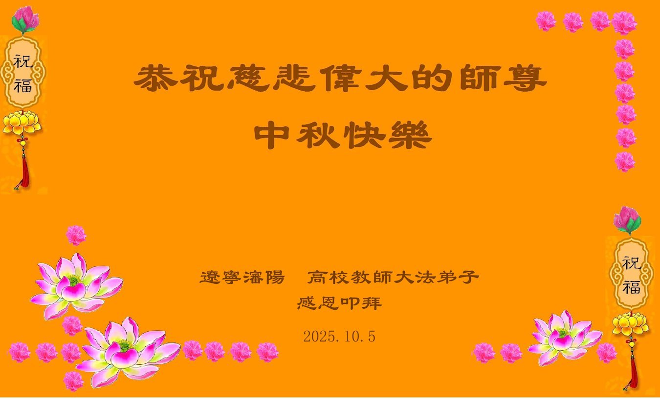 恭祝师尊中秋节快乐!无限感恩师尊的慈悲救度!法轮大法好!真善忍好!叩拜师尊! 辽宁省沈阳市一家大法弟子敬上 二零二五年十月四日 辽宁省沈阳高校教师大法弟子恭祝慈悲伟大的师尊中秋节快乐!