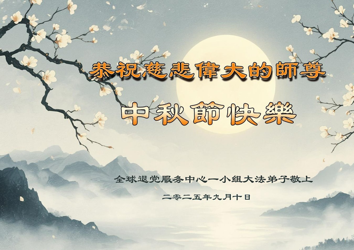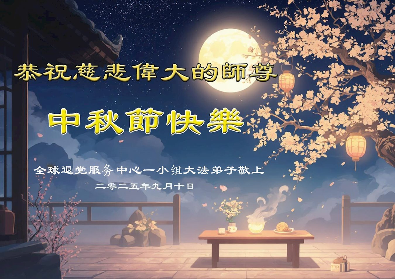 恭祝师尊中秋快乐!师父护我过难关,我一定加强正念,做好三件事。 中国大陆一漂泊异乡的独修大法弟子敬上 二零二五年九月九日 全球.退:党!服务中心一小组全体大法弟子恭祝师尊中秋节快乐!