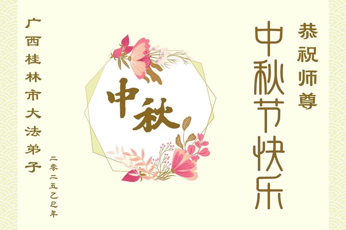 我们全家感谢师父救度之恩!谢谢师父将我们救起,把无比珍贵的宇宙大法赐予我们!我们会把大法的美好告诉更多的人,让他们明真相、得救度。 广西桂林市大法弟子恭祝师尊中秋节快乐!