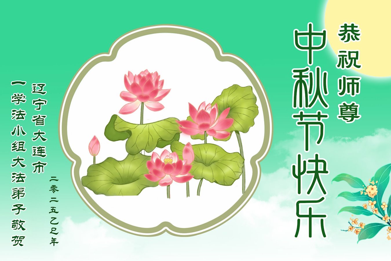 恭祝师尊中秋节快乐! 辽宁省葫芦岛市石油地区-学法小组大法弟子敬贺 2025年10月4日 辽宁葫芦岛兴城一五位大法弟子恭祝师尊中秋节快乐!