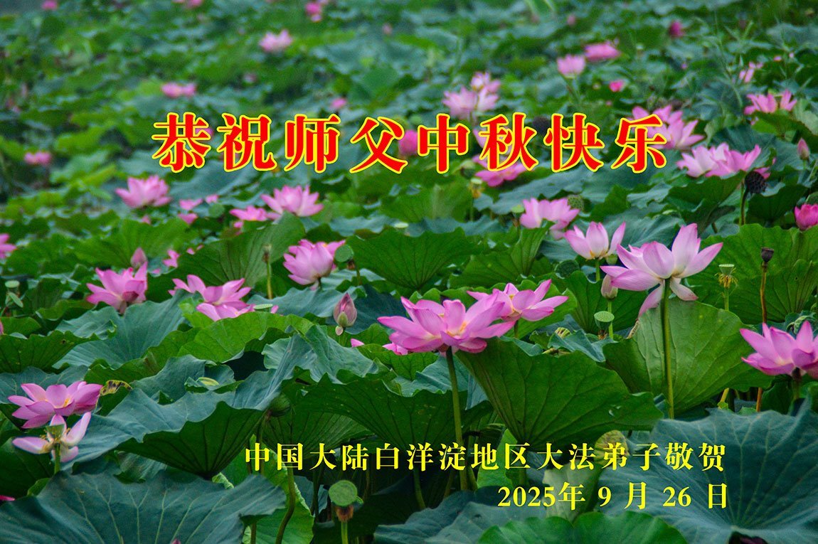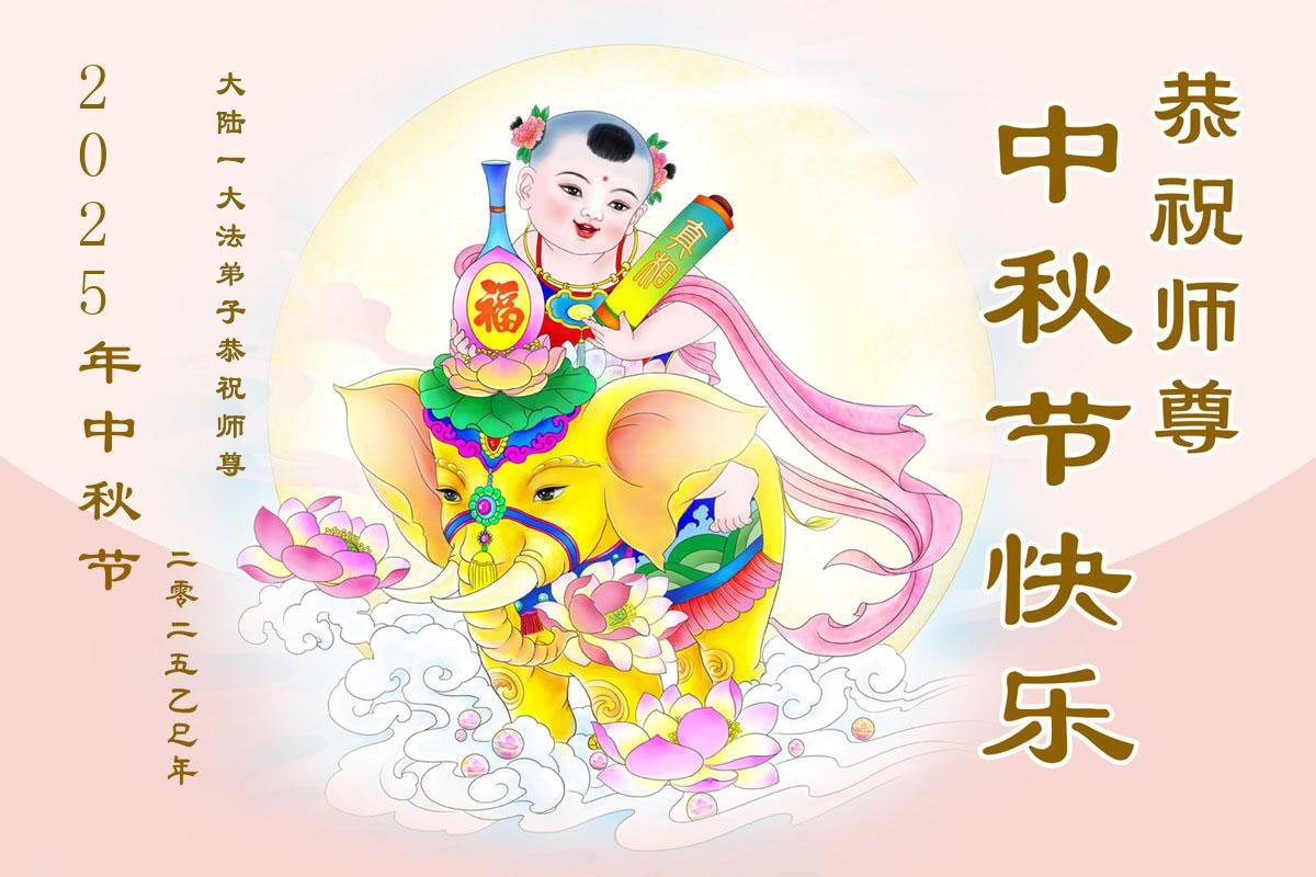 恭祝慈悲伟大的师父中秋节快乐! 感恩师父洪恩浩荡!坚修大法紧随师,跟上正法進程,做好三件事,同化大法真、善、忍,完成助师救人的历史使命,兑现誓约! 中国大陆一媒体成员大法弟子敬上 二零二五年九月三十日 大陆大法弟子恭祝师尊中秋快乐!