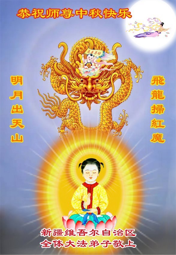 弟子非常想念师尊!盼望师尊早日回归中原!我们一定要做好三件事。我们一定要听师父的教诲,无论什么情况下都是以维护大法修好自己为第一位的。盼望师尊早日回来,感恩慈悲伟大的师尊!谢谢师尊! 新疆维吾尔自治区巴音郭楞州库尔勒市全体大法弟子恭祝师尊中秋快乐!