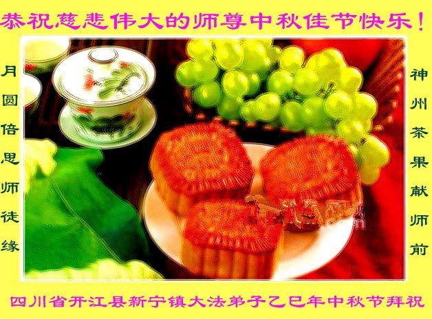 恭祝师尊中秋佳节快乐! 月圆倍思师徒缘 神州茶果献师前 四川省开江县新宁镇大法弟子 乙巳年中秋节拜祝 四川省达州市开江县全体大法弟子敬祝师尊中秋佳节快乐!
