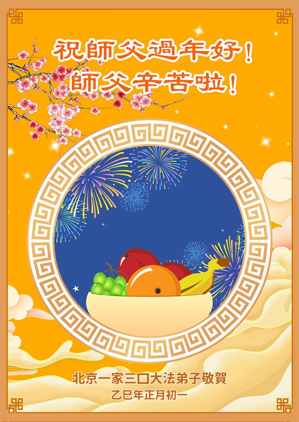 师尊您好! 新的一年到来,希望师尊少一些操劳,弟子们衷心感谢师尊的慈悲救度!弟子一定好好修,去掉执著,与同修们共同精進,多救人,谢谢师尊! 期盼师尊早日回大陆! 北京一家三口大法弟子敬上 乙巳年正月初一 北京大法弟子恭祝师尊新年快乐!