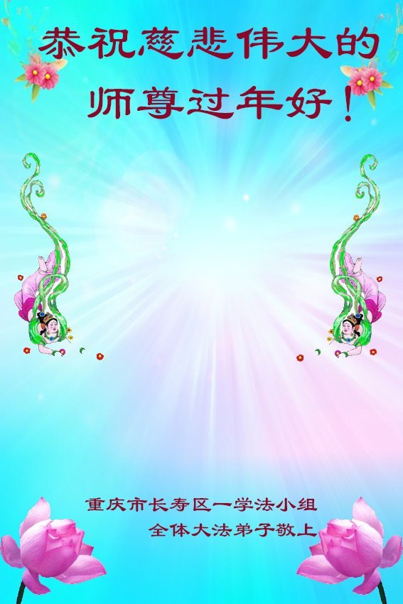 恭祝慈悲伟大的师尊过年好! 我们小组都是老年大法弟子,最小六十五岁,最大九十多岁。小组全体大法弟子在新的一年一定精進实修,做好三件事,维护大法,兑现誓约,跟师父回家! 重庆市长寿区一学法小组全体大法弟子敬上 重庆市高新区母子大法弟子恭祝师父过年好!