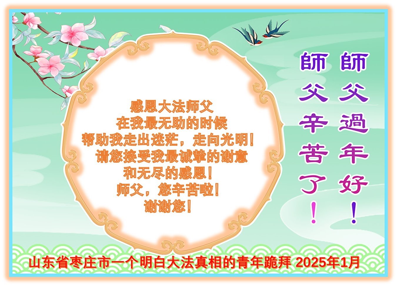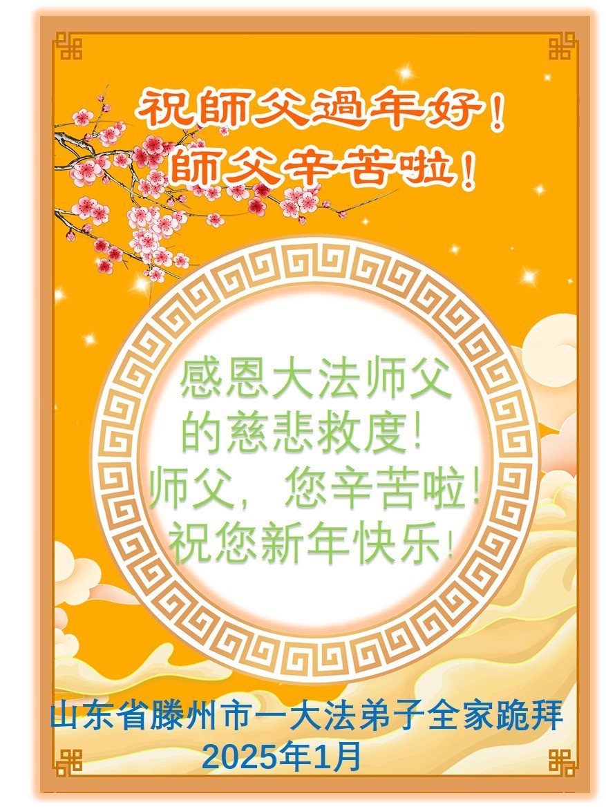 【明慧网二零二五年二月一日】 山东省枣庄市滕州市一大法弟子全家恭祝师父新年好!