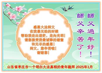 弟子要紧跟师父正法的進程,做好三件事,努力精進不懈怠,让更多世人明白真相,救度更多的世人。 山东省日照市一大法弟子及全家人叩拜 二零二五年一月二十三日 山东省烟台莱州市一全家大法弟子恭祝师父过年好!