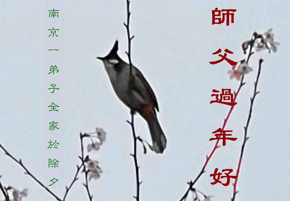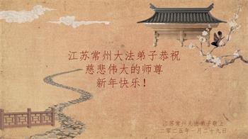 随师正法又一春, 坚修大法不动摇, 越是最后越精進, 认真学法不懈怠, 无私无我救众生, 弟子跪拜谢师恩! 江苏省无锡大法弟子恭祝师尊新年好!